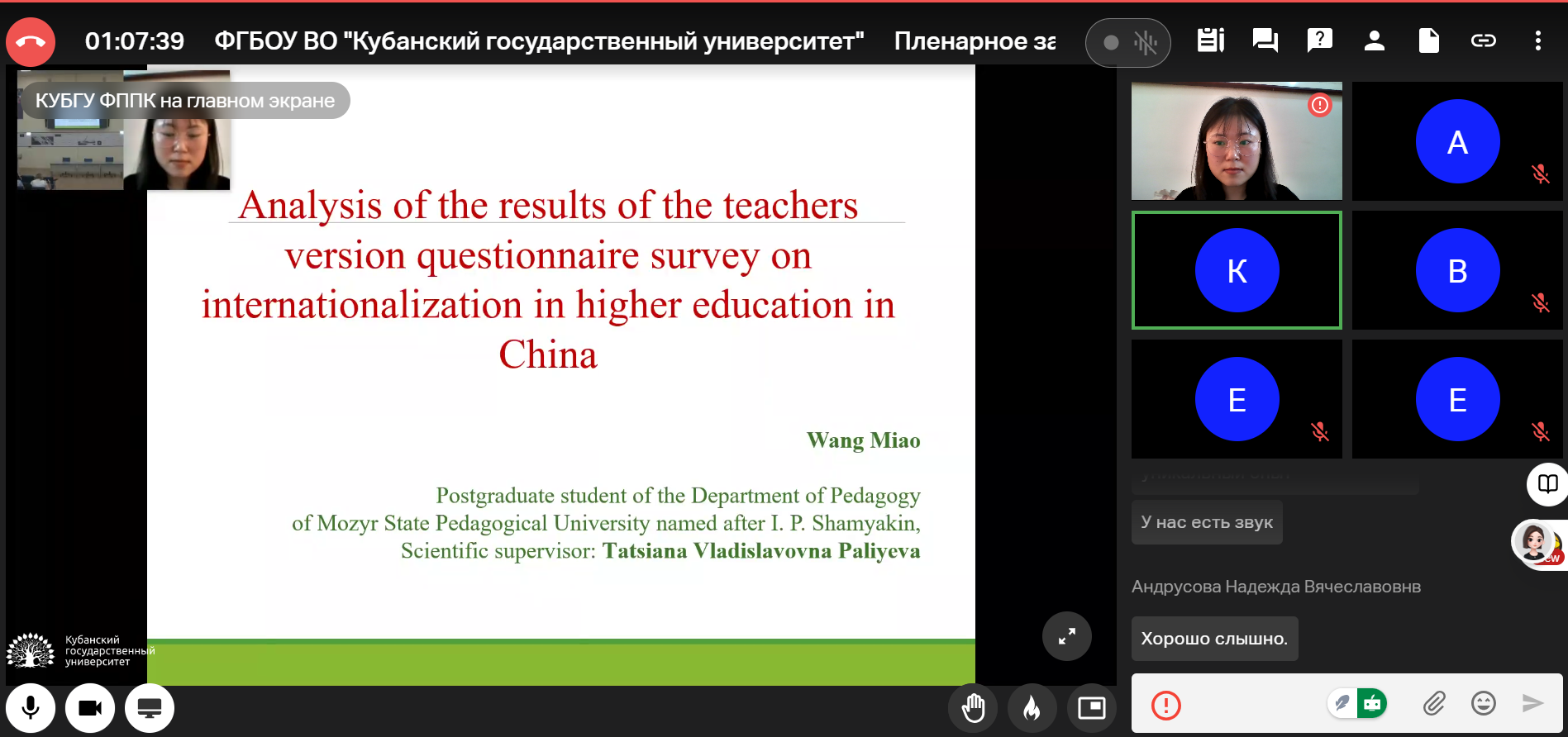 14 февраля стартовала Международная научно-практическая конференция «Сормовские чтения – 2025: научно-образовательное пространство, реалии и перспективы повышения качества образования», цель которой – обобщить имеющийся опыт работы в системе профессионального образования; выявить основные проблемы и противоречия учебно-воспитательного процесса, обменяться научной и практической информацией, провести апробацию результатов научно-практической деятельности. На пленарном заседании с докладом на тему «Анализ результатов анкетного опроса преподавателей по интернационализации высшего образования в Китае» выступила Ван Мяо, аспирант кафедры педагогики (научный руководитель – Татьяна Владиславовна Палиева, доцент кафедры педагогики), в работе секций конференции приняли участие преподаватели и студенты МГПУ им.И.П.Шамякина.