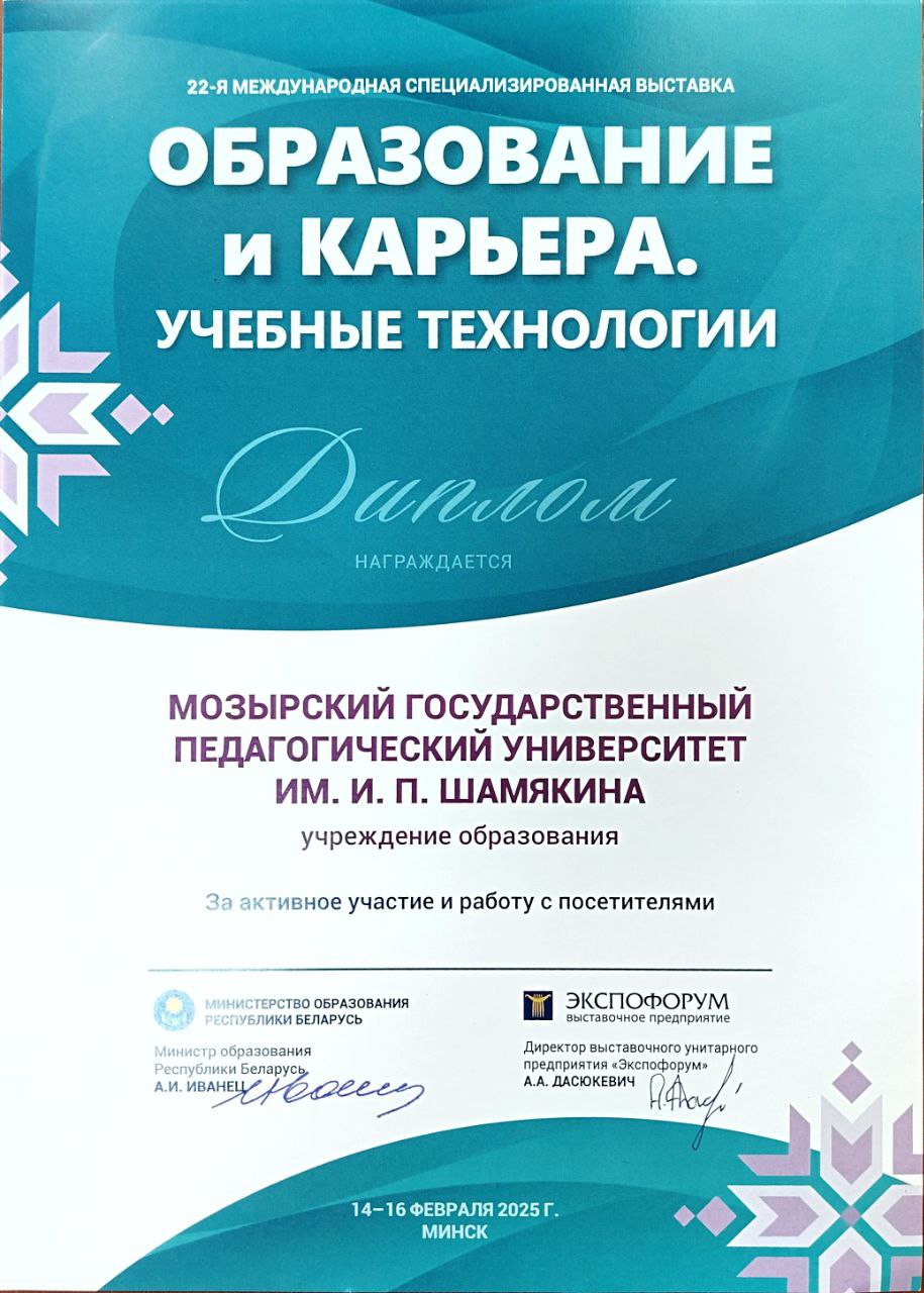 По итогам выставки МГПУ им. И.П.Шамякина вручен диплом «За активное участие и работу с посетителями».