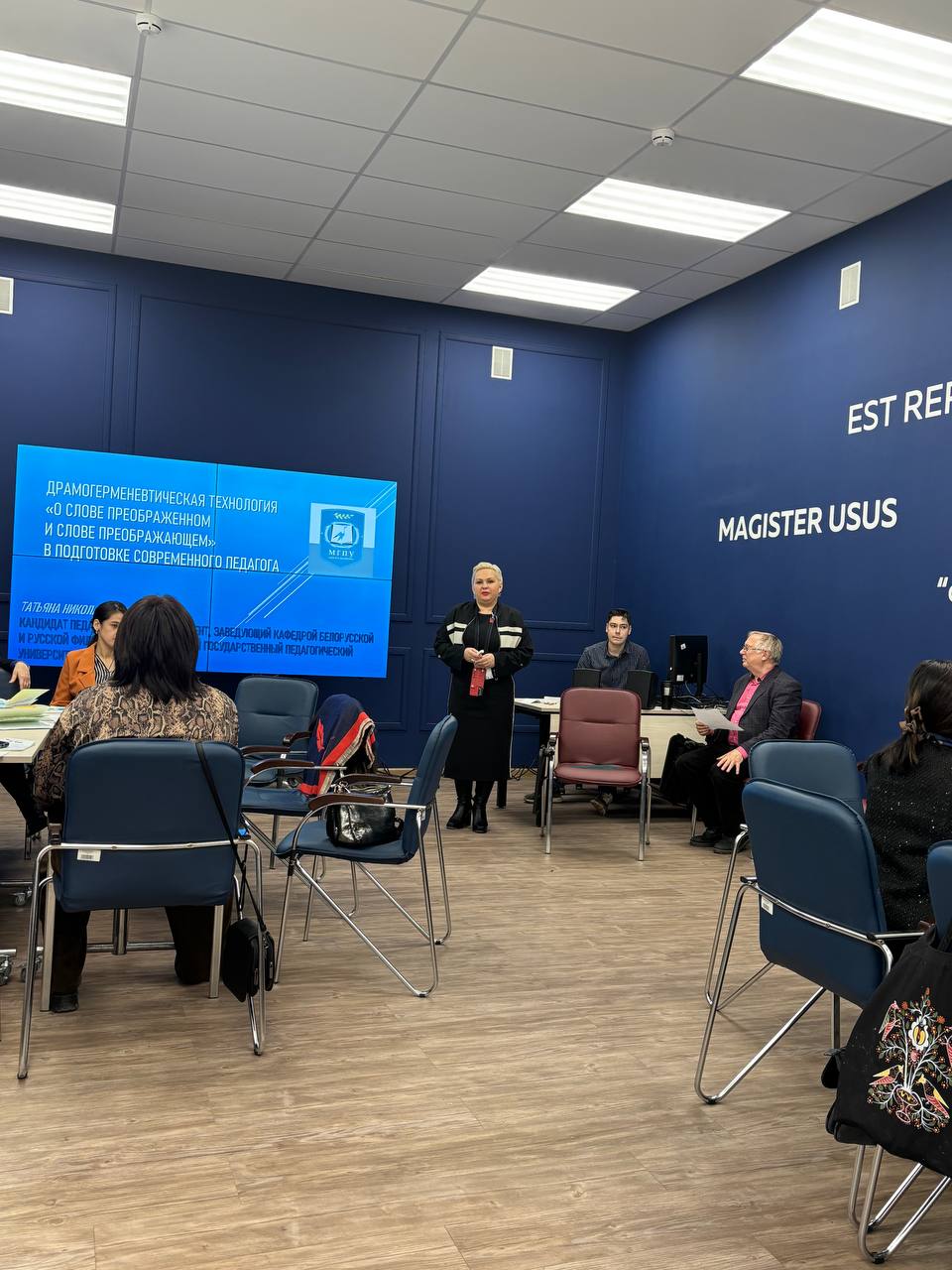 В рамках круглого стола слушателям была предоставлена возможность поделиться своими педагогическими новациями в преподавании русского языка и литературы. От МГПУ им. И.П. Шамякина был представлен опыт реализации драмогерменевтической технологии «О Слове Преображенном и Слове Преображающем». Особый интерес у слушателей вызвали содержание образовательного проекта «Я пишу Кодекс Учительского Сердца», способ трансляции компонентов региональной культуры (проект «Spadchyna»), презентация межкультурного полилога эпох («Поэтический диалог: Gold & Silber»). В основу драмогерменевтической технологии положена филологическая герменевтика, т.е. опыт реализации герменевтических стратегий трактовки художественного текста, которыми занимаются питерские ученые. Эти педагогические находки вызвали взаимный интерес, достигнута договоренность о дальнейшем сотрудничестве.