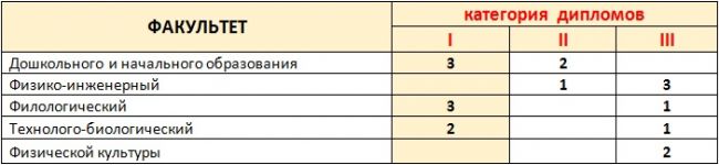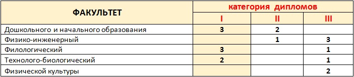 УО МГПУ им.И.П.Шамякина представил на конкурс 19 работ, из них 18 (95%) отмечены дипломами, 8 (42%) – отмечены дипломами 1 категории. Информация по факультетам представлена в таблице: