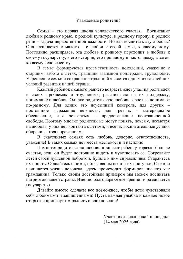 Обращение родителей в рамках областной диалоговой площадки «Счастливая семья – счастливое детство»