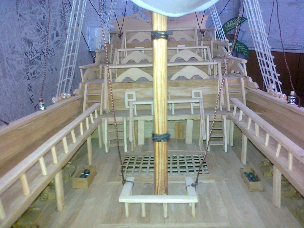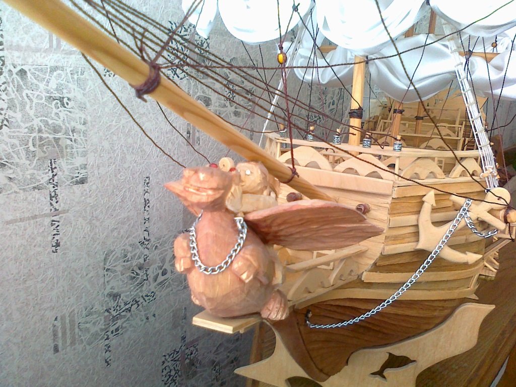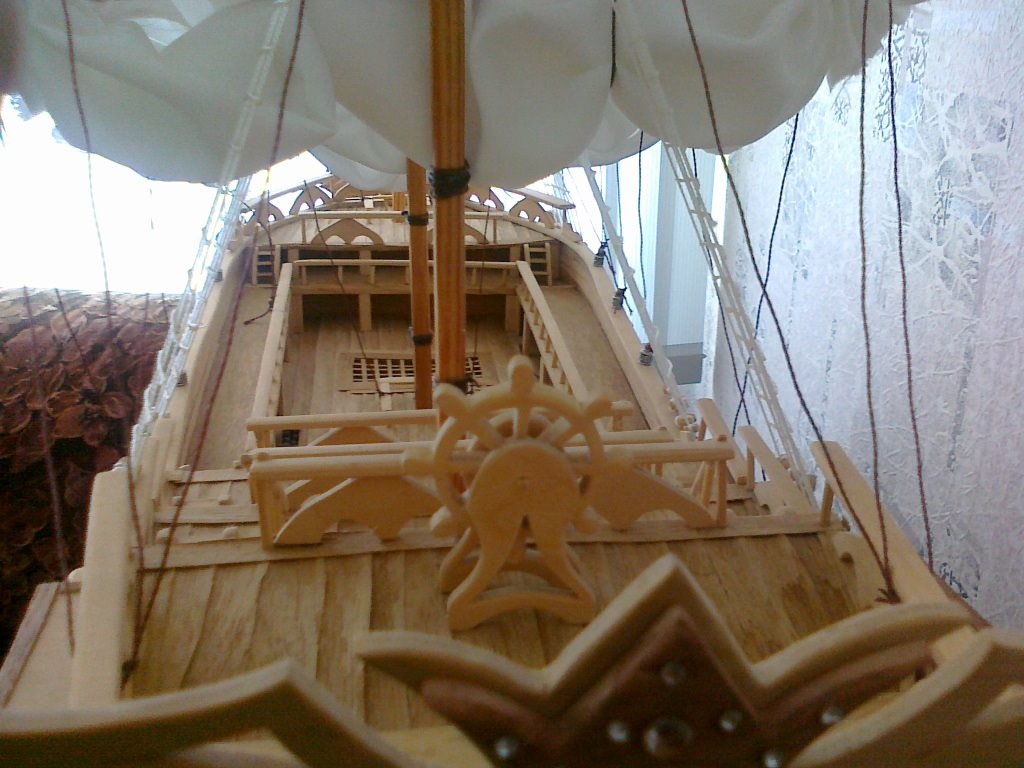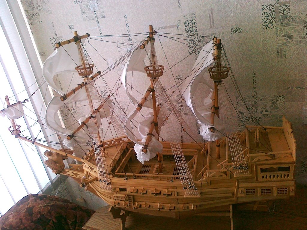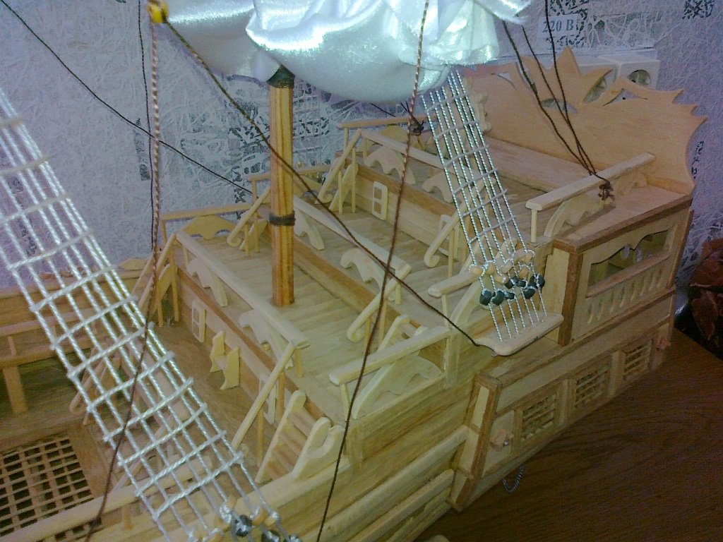 Длина данной модели более 1 метра. На нём много резных деталей с элементами пропильной, контурной, геометрической и объёмной резьбы по древесине; имеются контрастная отделка шпоном, деревянная мозаика (интарсия), художественное точение древесины и др. Наряду с обилием мелких деталей различных форм и назначения, главное внимание обращают на себя белые паруса, придающие модели лёгкость и романтичность. Изготовление данной оригинальной судомодели, по мнению Светланы Григорьевны, осуществляется на протяжении не менее 1 года. Общий вид и увеличенное изображение отдельных частей представлены на фотографиях.