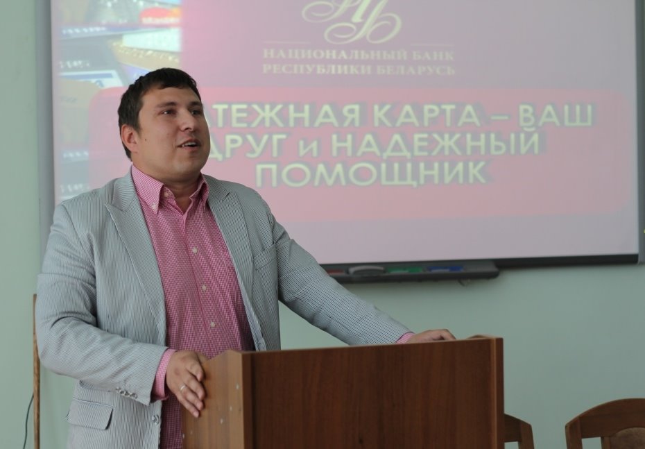Мельников С.А., ведущий специалист экономического управления Главного управления Национального банка Республики Беларусь по Гомельской области выступил с докладом на тему: «Платежная карта – ваш друг и надежный помощник».