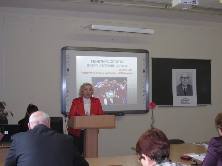 С интересным докладом «Генетика спорта: вчера, сегодня, завтра» выступила доктор биологических наук, профессор И.Б. Моссэ. Было отмечено, что данное направление в генетике является молодым, но очень перспективным. При подготовке спортсменов в современных условиях кроме предрасположенности к тем или иным видам спорта необходимо также учитывать и предрасположенность на генном уровне к определенным заболеваниям. Проблема генетического допинга, отбор спортсменов по генетическим паспортам, диагностика здоровья с учетом генетических исследований – вот лишь небольшой перечень современных задач спорта.