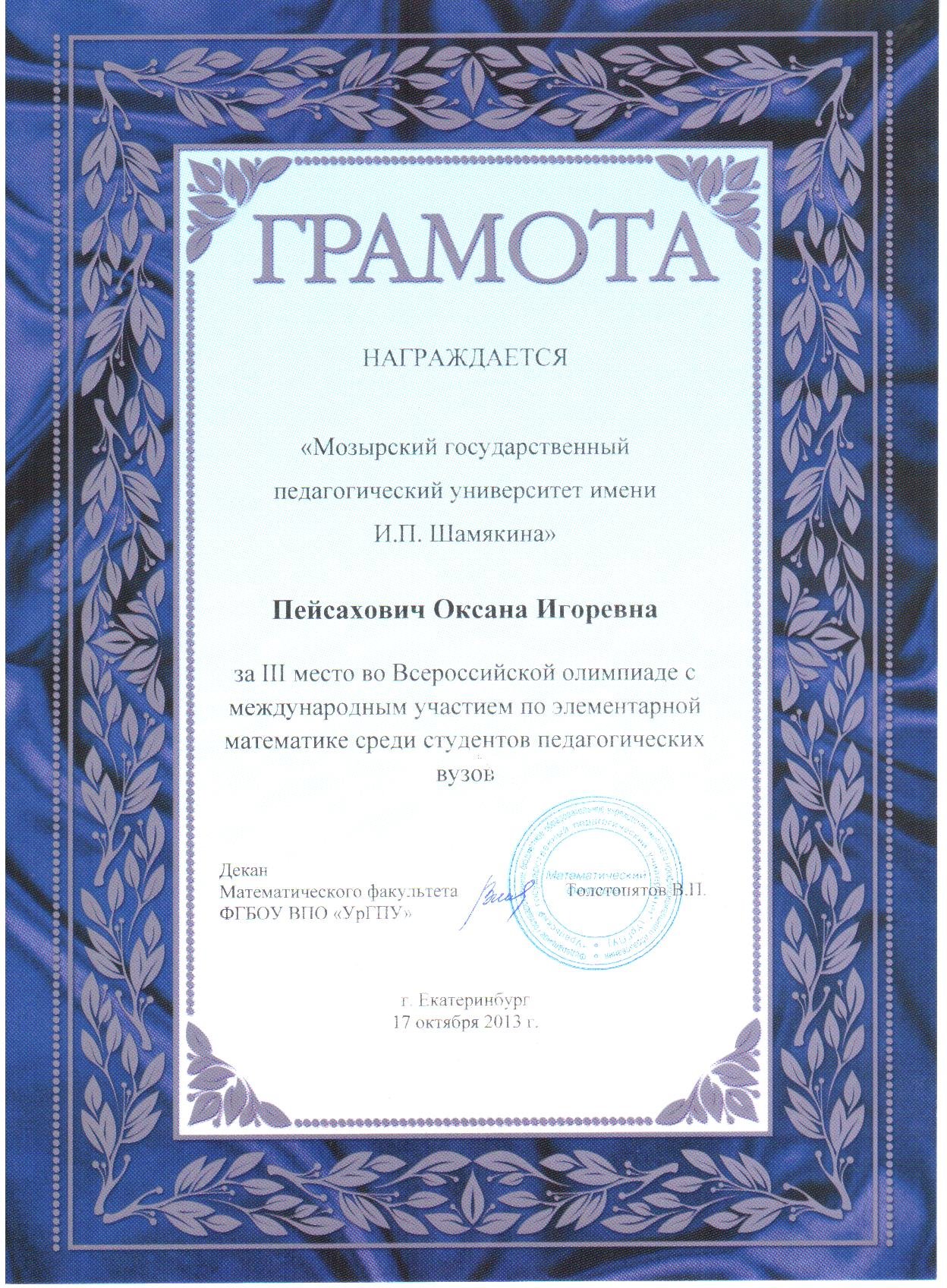 III место в олимпиаде по элементарной математике заняла студентка физико-математического факультета УО МГПУ им. И.П. Шамякина – Пейсахович Оксана. Жюри специально отметило оригинальность решений ряда задач, предложенных Оксаной.