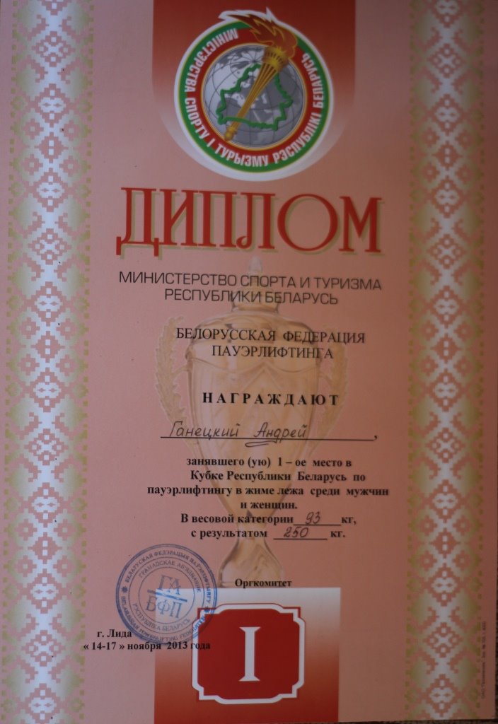 Поздравляем Ганецкого Андрея Сергеевича, инструктора-методиста по физкультурно-оздоровительной и спортивно-массовой работе, с завоеванием 1 места в Кубке Республики Беларусь по пауэрлифтингу в жиме лежа среди мужчин и женщин (весовая категория 93 кг), который проходил 14-17 ноября в г. Лида.
