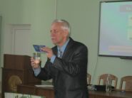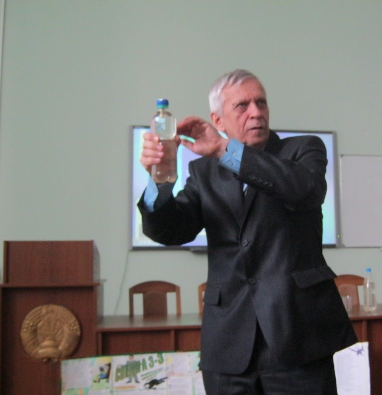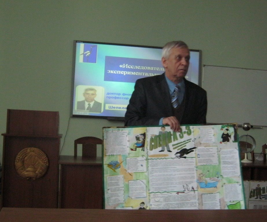 Затем выступил Василий Васильевич Шепелевич, доктор физико-математических наук, профессор, заведующий кафедрой теоретической физики, и продемонстрировал увлекательные физические опыты. Всё выступление Шепелевича В.В. было пронизано профориентационным смыслом: учиться на физико-математическом факультете интересно и перспективно.