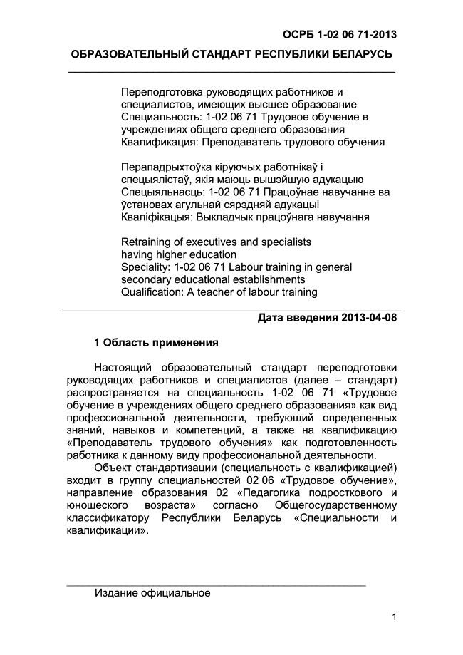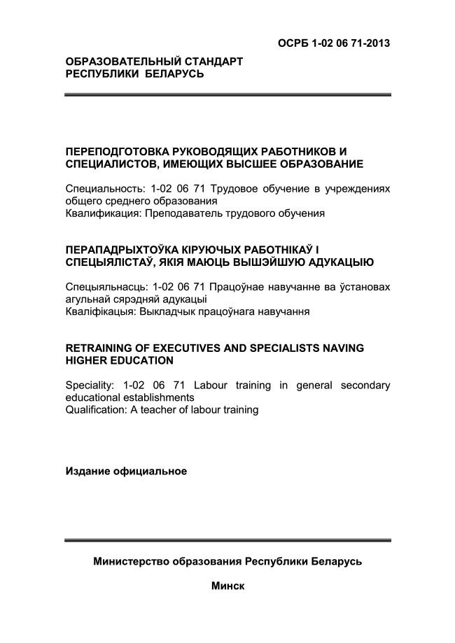 3. Образовательный стандарт ОСРБ 1-06 71-2013 “Переподготовка руководящих работников и специалистов, имеющих высшее образование”. – Введ. 28.03.2013., № 13 / С.Я. Астрейко, Е.В. Тихонова. – Минск: МО РБ, 2013. – 16 с.