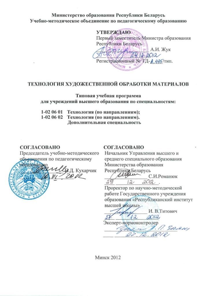 2. Технология художественной обработки материалов: типовая учебная программа. – Введ. 29.12.2012., № ТД-А.435 / С.Я. Астрейко [и др.]. – Минск: РИВШ, 2013. –с. (в соавт. Карабанов И.А., Жадик Н.П., Македонский А.Н.).