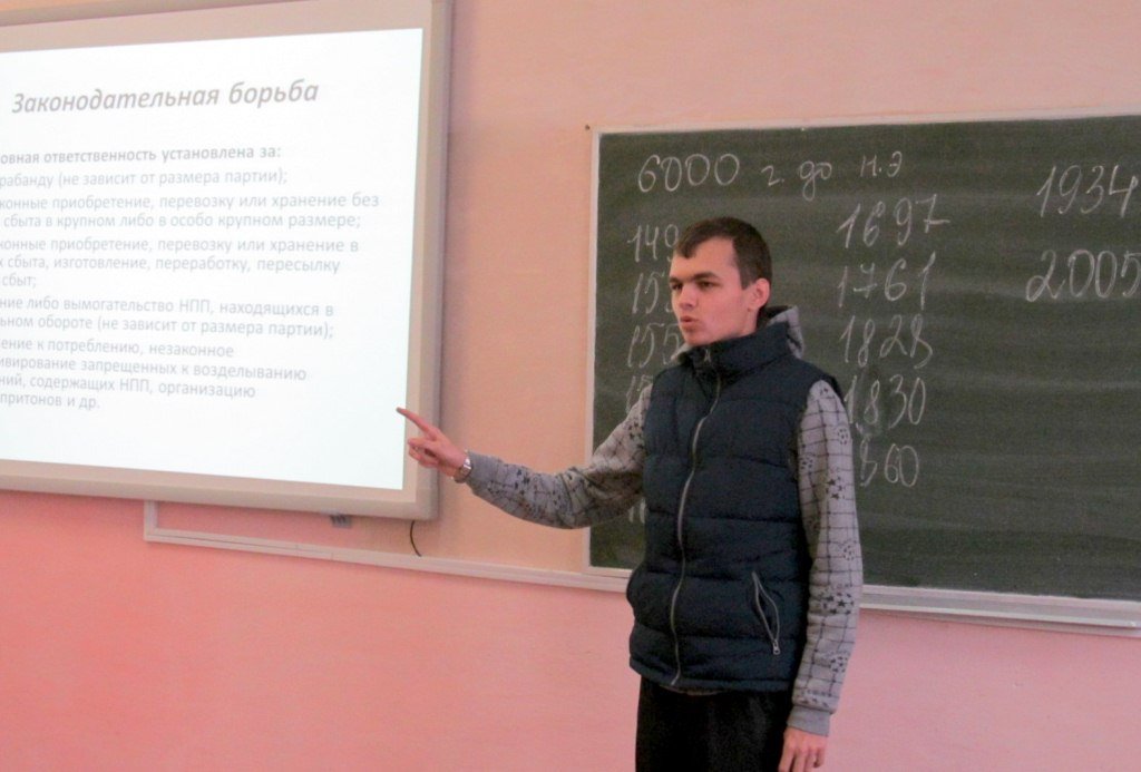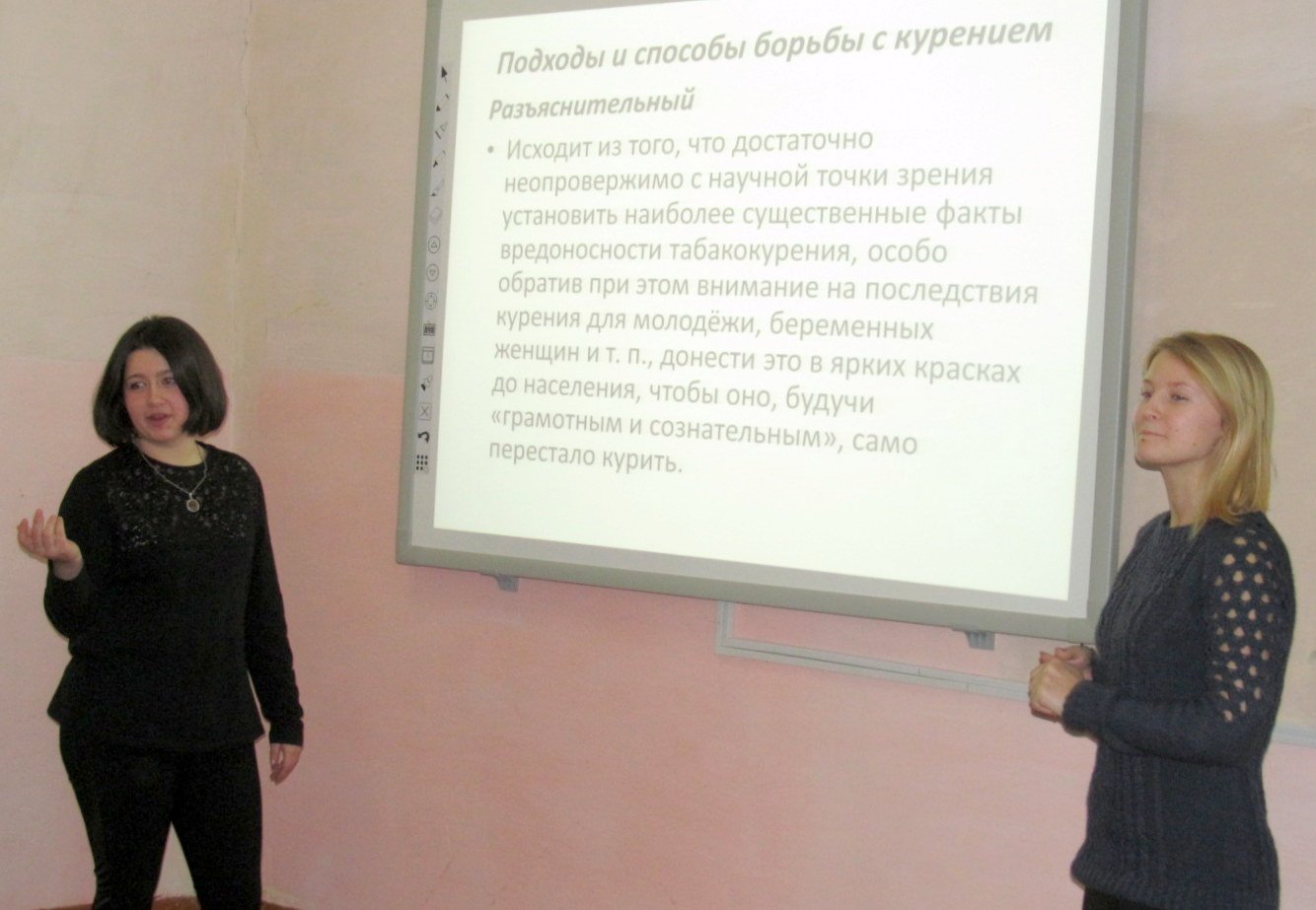 Студенты группы рассказали об истории табакокурения, способах борьбы с курением, а также о видах наркотиков и последствиях их употребления, обсудили способы формирования устойчивой позиции по отношению к употреблению вредных веществ. Затем куратор группы продемонстрировала видеоролик о вреде курения и социальную рекламу на тему наркомании и провела обсуждение в группе.