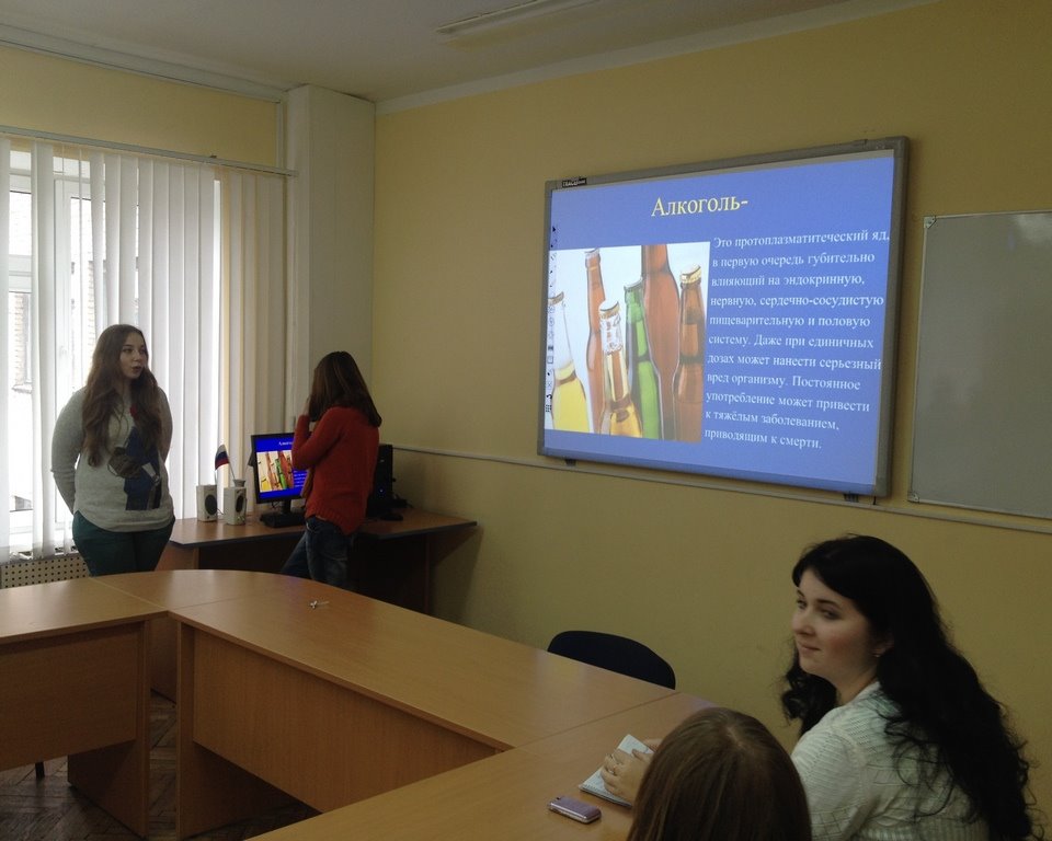 Студенты группы проявили живой интерес к обсуждаемой проблематике. К мероприятию творческие команды, на которые разделилась группа, подготовили презентации и выступления по вопросам профилактики алкоголизма, наркомании, употребления спайсов и, в целом, пропаганды здорового образа жизни. В заключении сами студенты предприняли попытку сформулировать основные правила ЗОЖ.