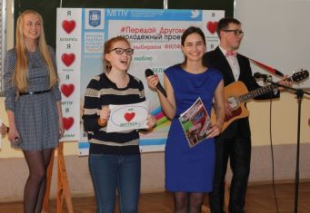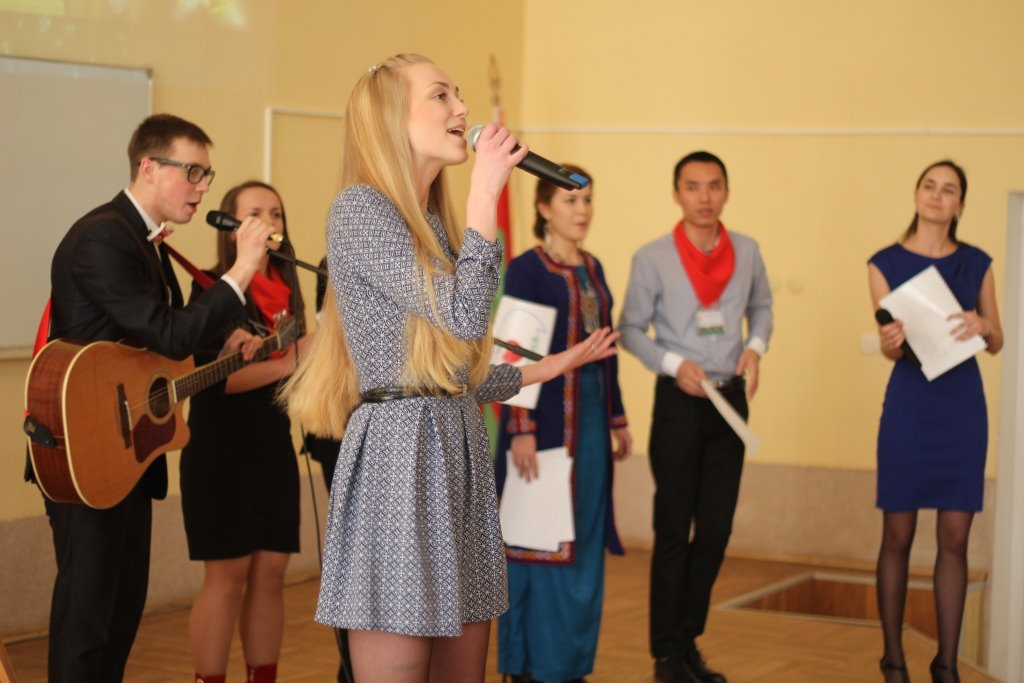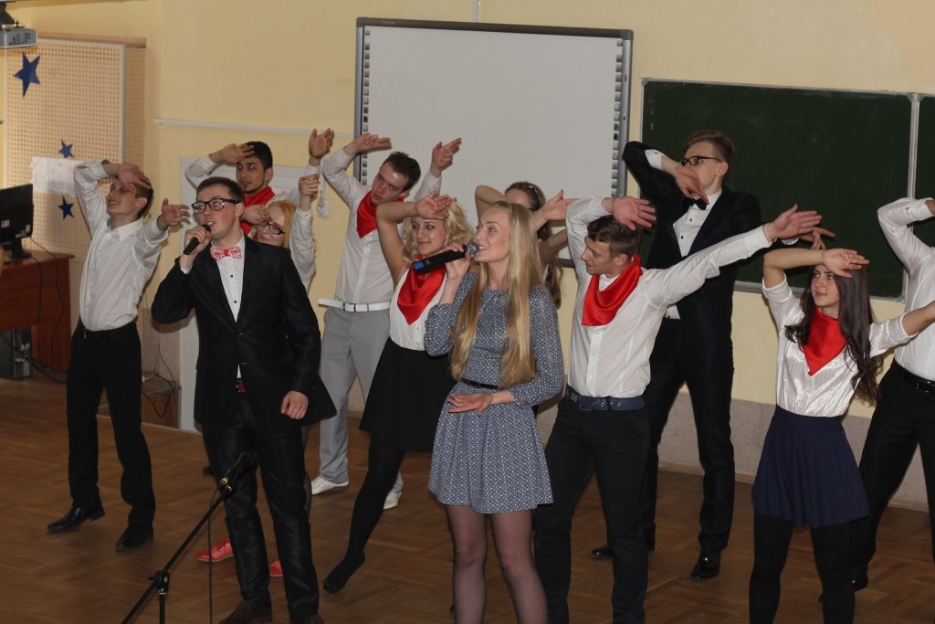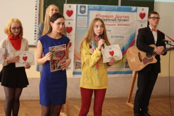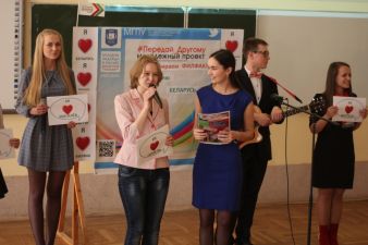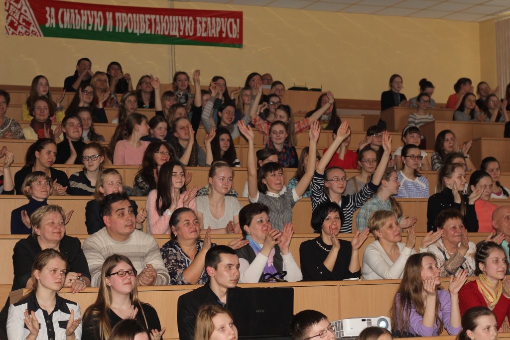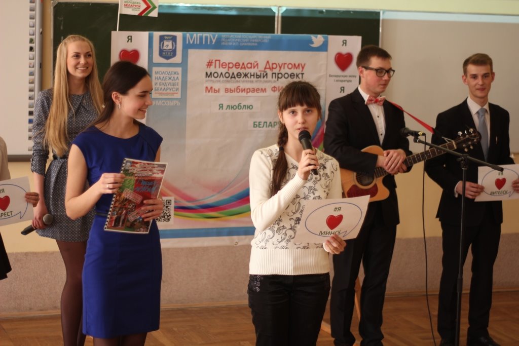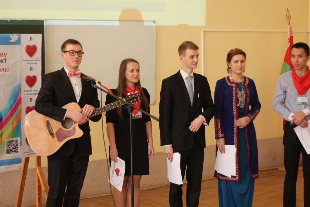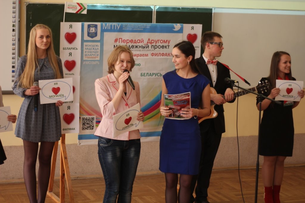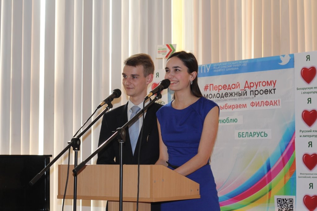 Школьников приветствовали студенты филологического факультета – неоднократные участники и победители республиканских молодежных фестивалей и конкурсов. Большой интерес вызвал представленный ими проект «Передай другому: я люблю Беларусь», в котором приняли участие представители учащейся молодежи каждой области (руководитель проекта И.Л. Судибор, зам. декана по воспитательной работе). Бурными аплодисментами зал встретил выступление команды молодого поколения филфаковцев «СССР».