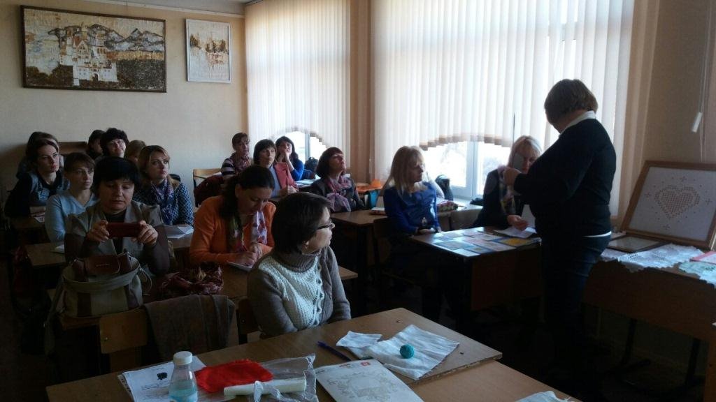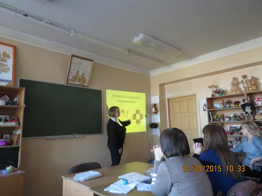 Практическая часть семинара была посвящена анализу развивающих возможностей нетрадиционных видов вышивания, которые могут быть реализованы при изучении вариативной части учебной программы по обслуживающему труду. Был заслушан доклад Тихоновой Е.В., зав.кафедрой ТОиИИ, в котором были отражены технологические особенности и творческие возможности таких видов вышивания, как «Хардангер» и «Барджелло». Особый интерес вызвало мультимедийное сопровождение, представляющее собой наглядную инструкцию, и анализ выставки работ в технике «Хардангер».