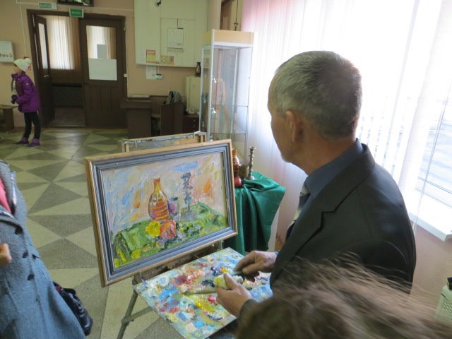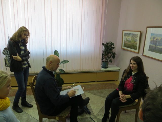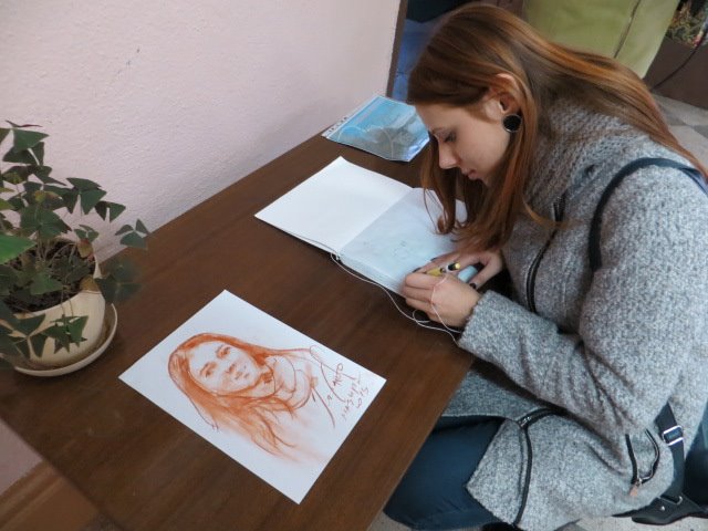Кульминацией вечера стал мастер-класс. Прямо на глазах присутствующих создавался живописный натюрморт, очаровательные портреты. Юные мозыряне, в том числе и наши студенты, с удовольствием позировали Евгению Шунейко и Владимиру Сайко. После этого портреты они могли забрать с собой.