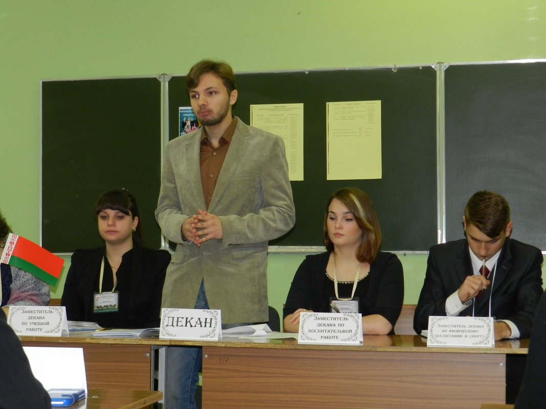 В этот день студенты осуществляли административные функции управления факультетом: Горбачук В. – декан факультета, Шаврей А. – зам. декана по учебной работе, Кунгер К. – зам. декана по воспитательной работе, Ширко А. – зам. декана по научной работе, Макеев А. – зам. декана по физической культуре и спорту и др.