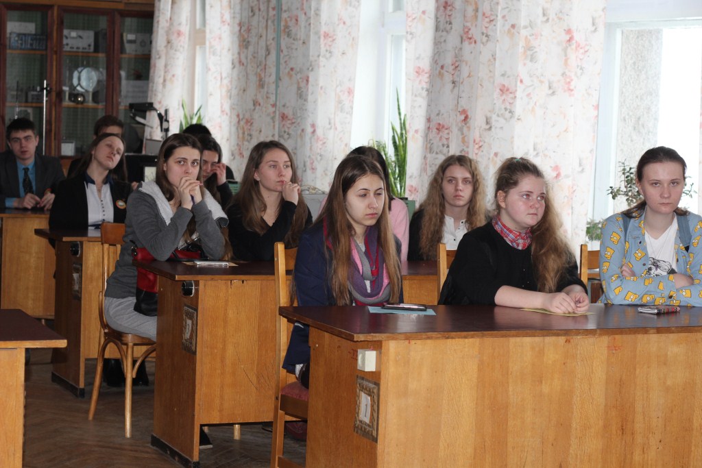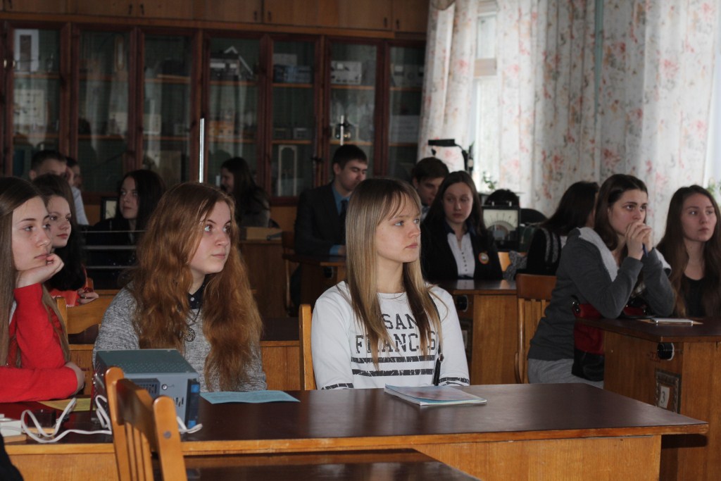 Заведующий кафедрой теоретической физики и прикладной математики, профессор, доктор физико-математических наук Шепелевич В.В. рассказал гимназистам об особенностях работы кафедры со студентами, о перспективах привлечения их к научным исследованиям, о результатах деятельности кафедры по подготовке кандидатов наук по физике из числа студентов факультета. Были продемонстрированы занимательные физические опыты и их теоретическая интерпретация («Задача о шарах», «Опыт А.С. Попова», «Физика создания радуги» и др.), голограммы, стенные газеты «Спецназ» (СПЕЦиально Нам Адресованные Задачи), выпущенные студентами, а также рекомендована литература для самостоятельной исследовательской работы по физике.