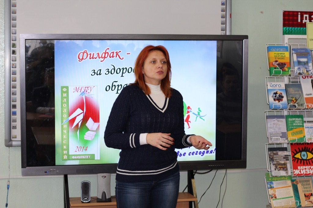О профилактике зависимости человека от вредных привычек подробно и познавательно рассказала психотерапевт Медведева О.Ю., призвала студентов получать удовольствие от жизни без вредных привычек. С информацией об основных направлениях деятельности профилактория УО МГПУ им. И.П. Шамякина в системе оздоровления студентов выступил Гончаров В.Н.. Инфосессию «Выбери жизнь» со студентами провел Латышев К В ходе проведения встречи состоялся открытый диалог студентов по вопросам здорового образа жизни. Все пришли к выводу, что невозможно насильно сделать кого - либо здоровым или счастливым, поскольку это внутреннее состояние человека. На протяжении всего мероприятия работала выставка научной и познавательной литературы «Молодежь Беларуси – за здоровый образ жизни», подготовленная сотрудниками библиотеки.