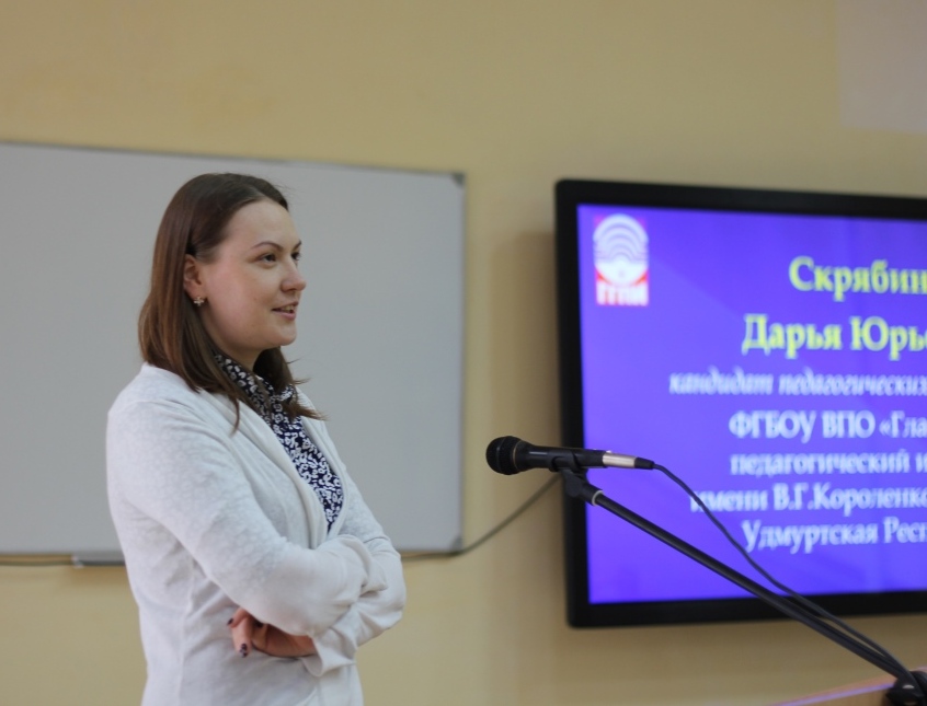 Дарья Юрьевна Скрябина (ФГБОУ ВПО «Глазовский педагогический институт им. В.Г. Короленко», г. Глазов), кандидат педагогических наук, доцент, ознакомила участников пленарного заседания с особенностями организации инклюзивного образовательного процесса в МОУ СОШ №5 г.Глазова, в котором реализуется ФГОС для детей с интеллектуальными нарушенями.