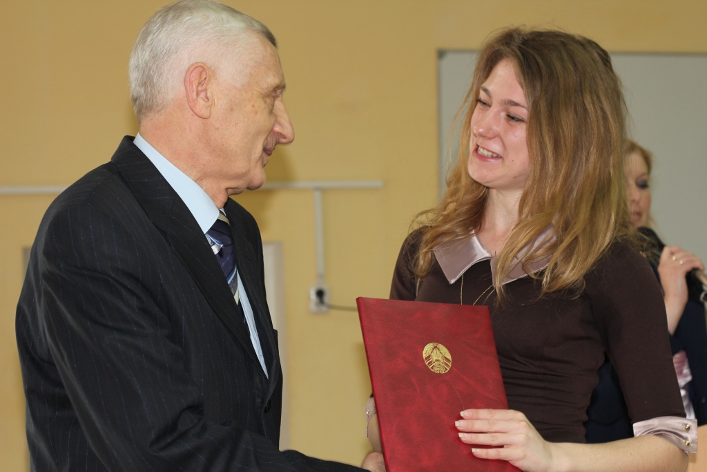 Первый проректор университета, кандидат педагогических наук, доцент Валерий Сергеевич Болбас вручил свидетельство о назначении Стипендии Президента Республики Беларусь Синицкой Илоне, а также Грамоты университета студентам, достигшим высоких результатов в научно-исследовательской деятельности: