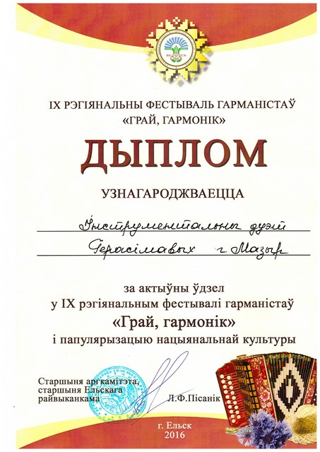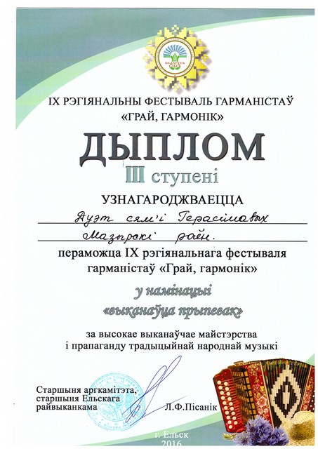 В фестивале, Мозырский район представляла семья гармонистов Герасимовых (мама – Наталья и дочь - Анна). Они награждены Дипломом 3 степени, Дипломами за участие и поощрительным призом.