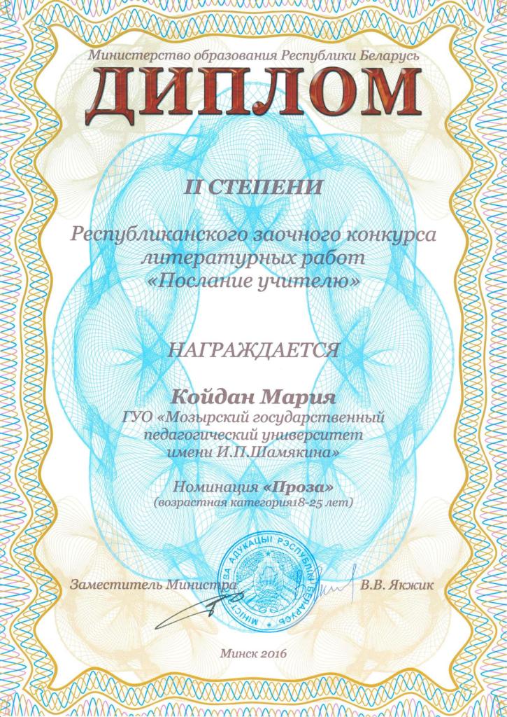Студентка 3 курса 1 группы филологического факультета Койдан Мария стала обладательницей диплома II степени в номинации «Проза».