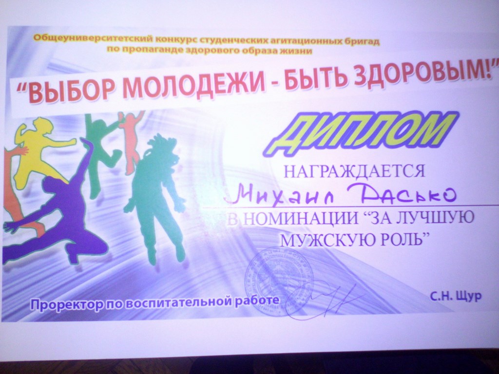 Отдельно было оценено выступление студента 2 курса 1 группы Дасько Михаила, который выступил очень ярко и артистично. Ему была присуждена номинация «Лучшая мужская роль».