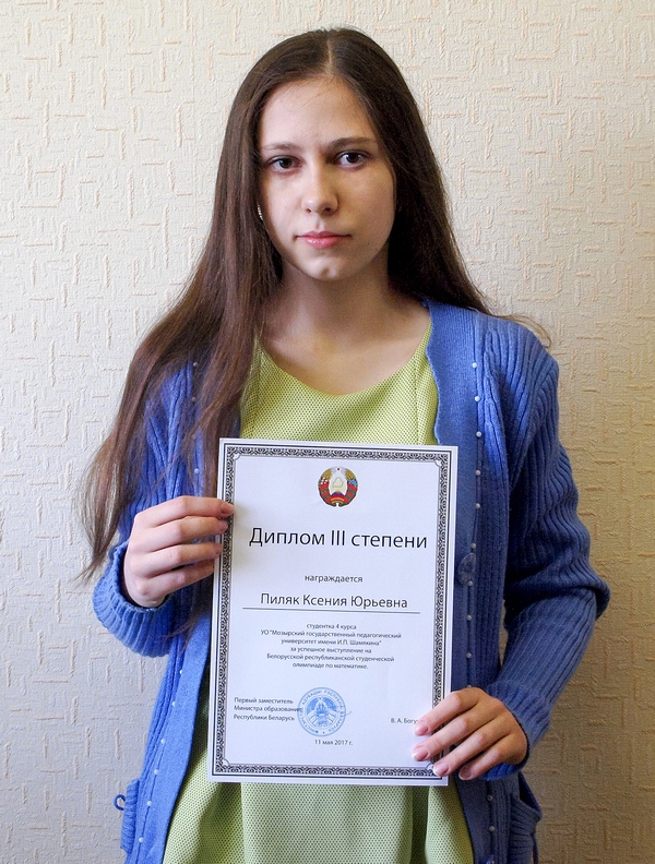 За время учебы Пиляк К.Ю. зарекомендовала себя дисциплинированной, серьезно относящейся к своим обязанностям студенткой. Проявляет интерес к предметам физико-математического цикла. Ксения имеет высокие учебные достижения: средний балл за время обучения составляет 9,9. Получает стипендию Президента РБ.