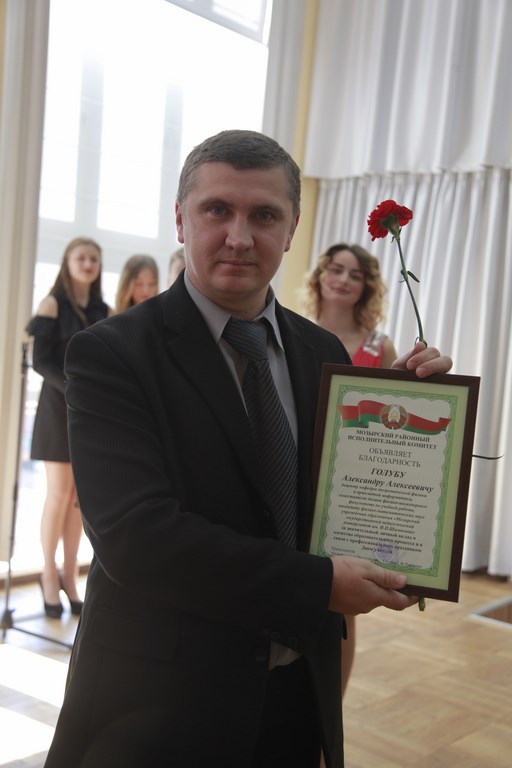Искренние слова поздравления прозвучали от почетного гостя мероприятия – председателя Мозырского районного Совета депутатов Сергея Александровича Гвоздя, который вручил Грамоту Мозырского районного исполнительного комитета Елене Владимировне Тихоновой, доценту кафедры методики технологического образования и Благодарность Мозырского районного исполнительного комитета Александру Алексеевичу Голубу, заместителю декана физико-инженерного факультета, доценту кафедры теоретической физики и прикладной информатики.