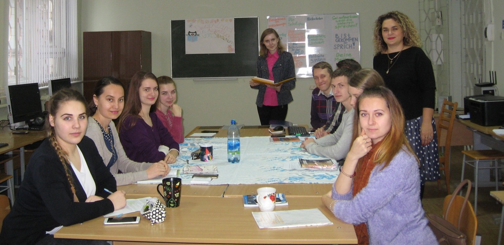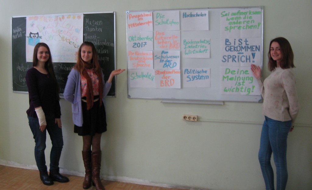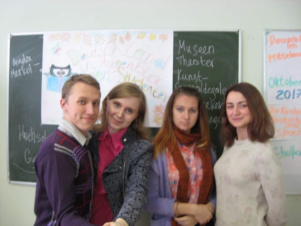 Так, студенты самостоятельно подготовили, организовали и представили данный проект в форме заседания круглого стола, где обсуждались проблемные вопросы, выступали ведущие (Светогорова Настя и Полуян Галина) и эксперты (Пилипончик Ирина и др.). Они сопровождали свои представления яркими слайдами в презентациях и видео фрагментах. Для подведения итогов была назначена экспертная группа (Ковалёв Михаил и Ковалёв Ян), в задачи которой входило заполнение графического организатора с описанием представленных в обсуждении фактов и событий. Ребята подготовили викторину, кроссворд и игру на знание активной лексики по теме. Лучшими в этом виде деятельности были признаны Акыева Джахан и Воднева Анжелика. Мероприятие сопровождалось музыкальными паузами известных немецких исполнителей и яркими инсценировками (Жизневская Катя и др.).