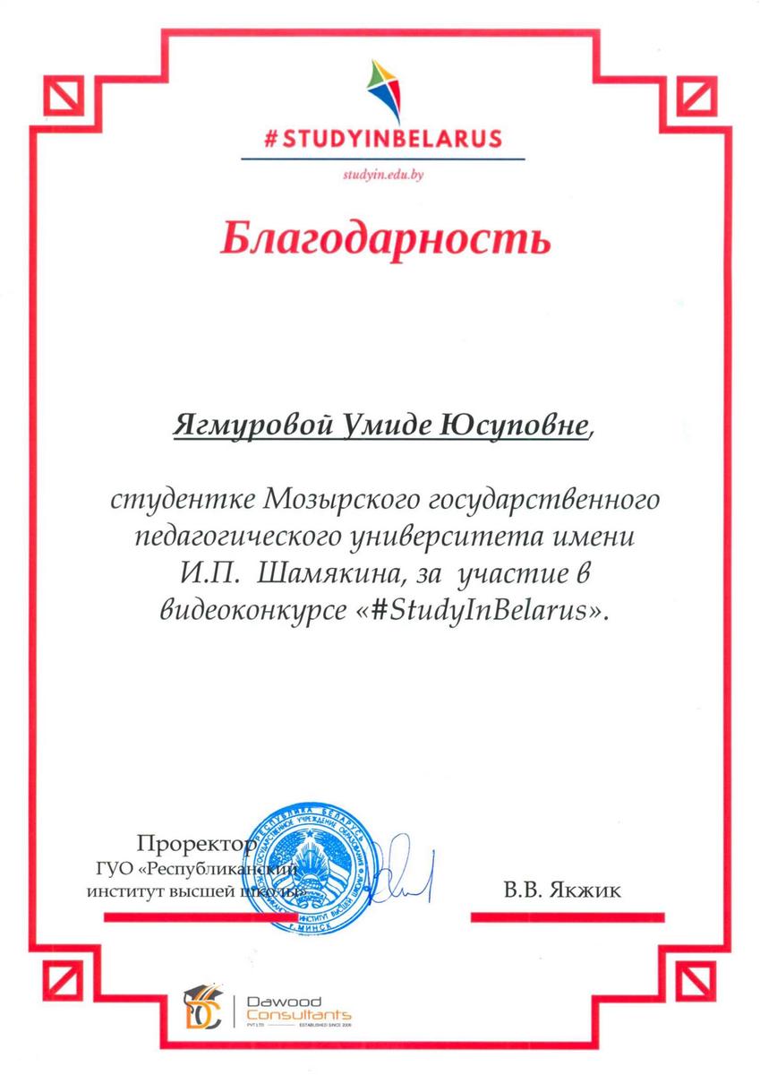 СТУДЕНТКА ФИЛОЛОГИЧЕСКОГО ФАКУЛЬТЕТА ЯГМУРОВА УМИДА ПОЛУЧИЛА БЛАГОДАРНОСТЬ ЗА УЧАСТИЕ В ВИДЕОКОНКУРСЕ«#STUDYINBELARUS»