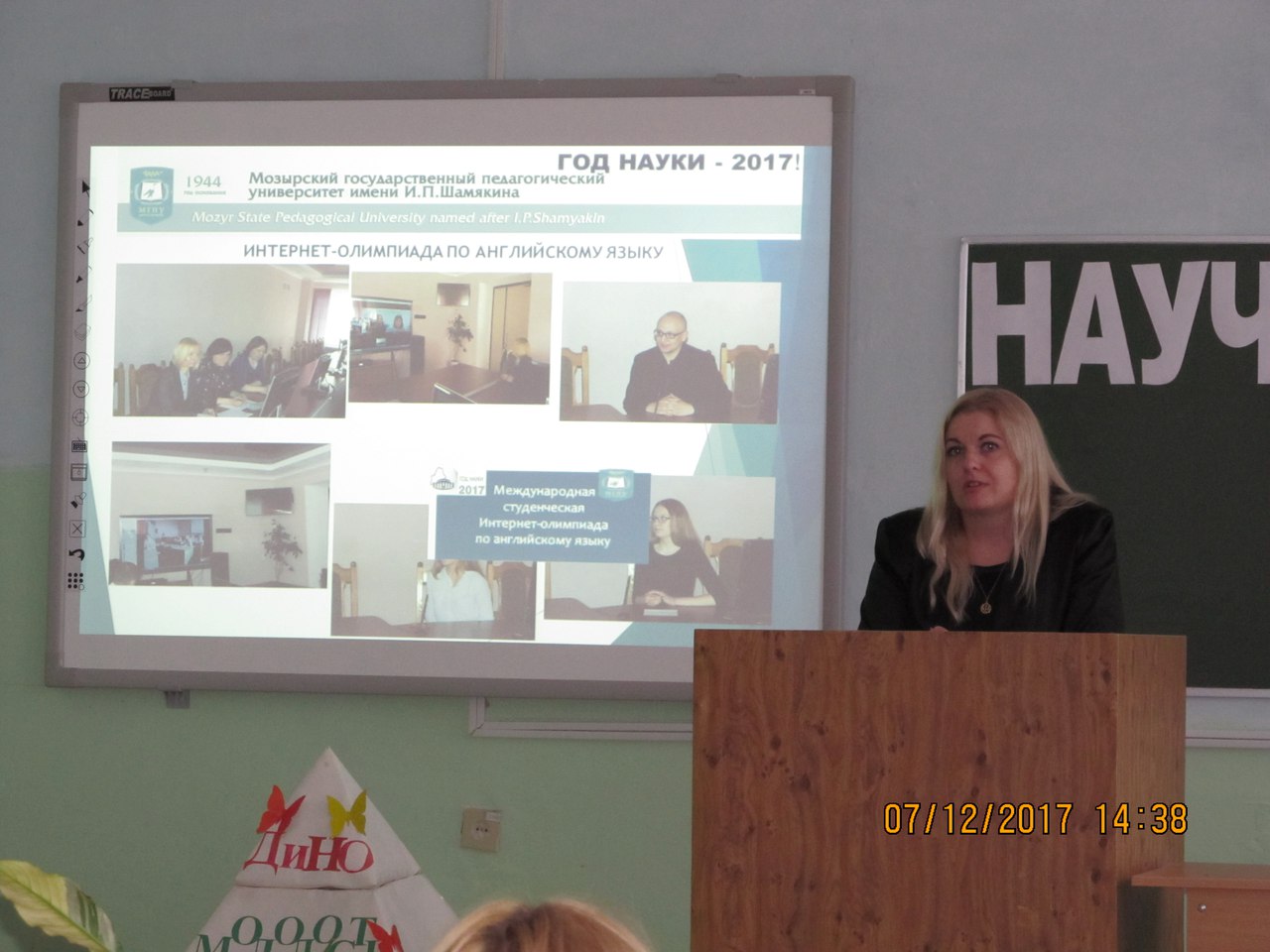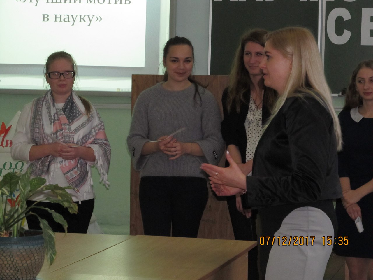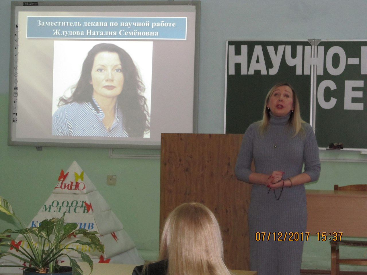 Председатель студенческого научного общества, кандидат филологических наук, доцент Ковалева Елена Валерьевна познакомила присутствующих с деятельностью научных студенческих кружков и лабораторий.