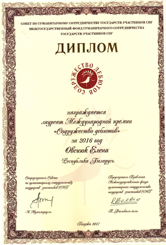 Поздравляем Овсиюк Елену Михайловну – Лауреата Международной премии «Содружество дебютов»!