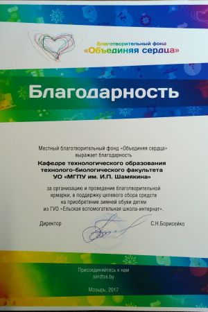 На ярмарке присутствовала директор МЕСТНОГО БЛАГОТВОРИТЕЛЬНОГО ФОНДА «ОБЪЕДИНЯЯ СЕРДЦА» СВЕТЛАНА НИКОЛАЕВНА БОРИСЕЙКО. Отрадно отметить, что сотрудничество с этим фондом стало уже доброй традицией для нашего факультета. В ходе этой встречи фонду были переданы швейные изделия и текстильные игрушки для детей, находящихся в заведениях интернатного типа, изготовленные руками студентов, обучающихся по специальности «Обслуживающий труд и изобразительное искусство».