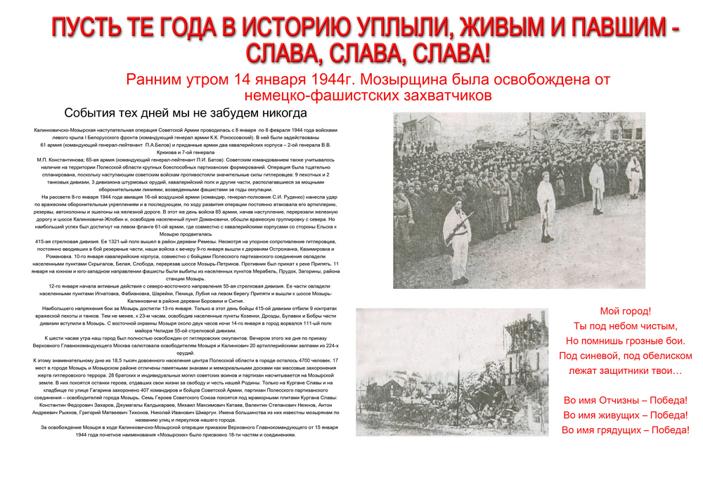 14 января 1944 года войска Первого Белорусского фронта, поддержанные бойцами Полесского партизанского соединения, освободили г. Мозырь от немецко-фашистских захватчиков. В боях за город 17 частей и соединений Советской Армии получили наименование «Мозырских». О тех героических днях напоминают нам боевые машины и орудия на постаментах, устремленные ввысь обелиски, бетонные и мраморные плиты мемориала Кургана Славы, где покоятся останки бойцов и командиров Советской Армии, полесских партизан, отдавших свою жизнь.