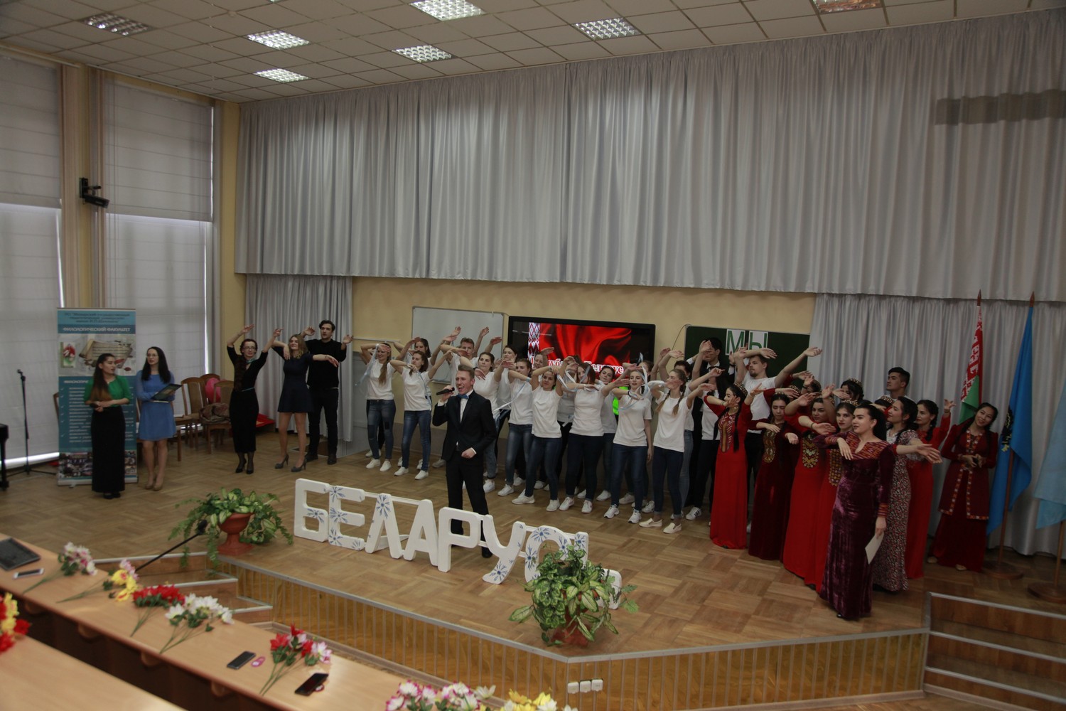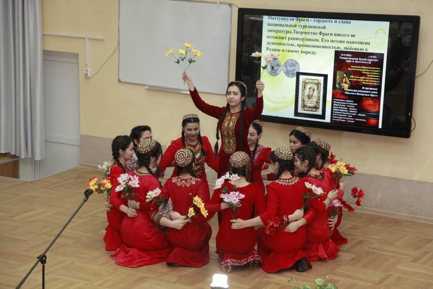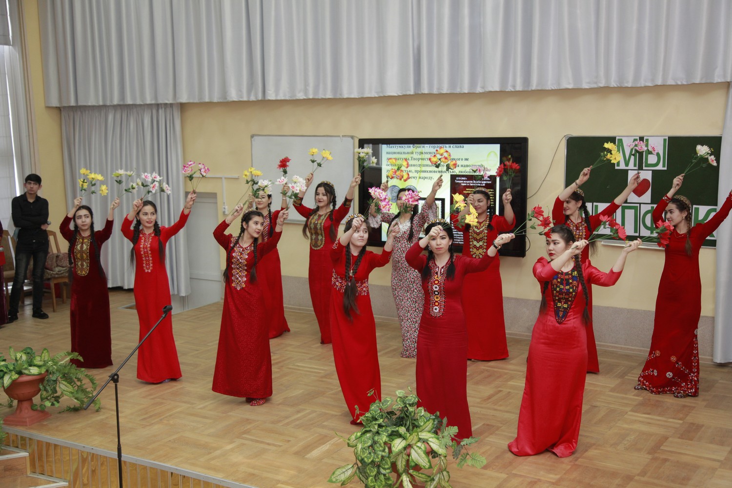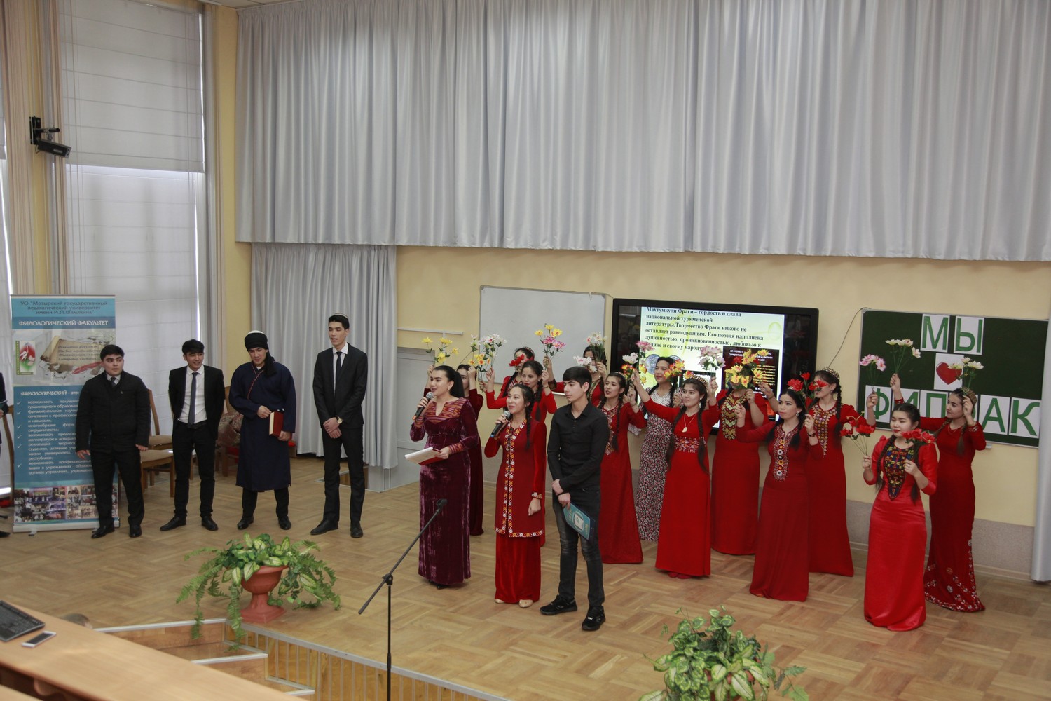 Студенты из Туркменистана Ягмурова Умида, Шакуров Камиль, Эййамбердиев Ашыр, Азизов Эламан, участники танцевального ансамбля «Цветы Туркмении» погрузили нас в поэзию известного туркменского поэта Махтумкули и реализовали на сцене творческий проект «Öne dine öne jan watanym Тurkmenistan!» (Вперёд, Туркменистан!).