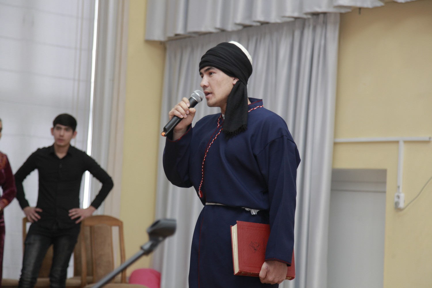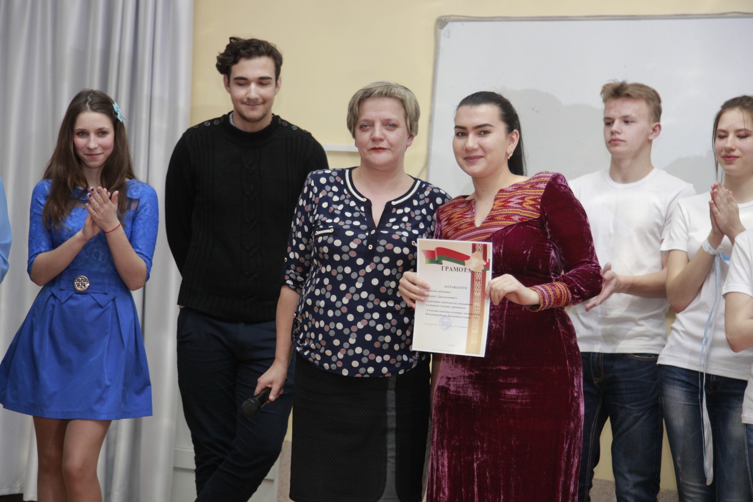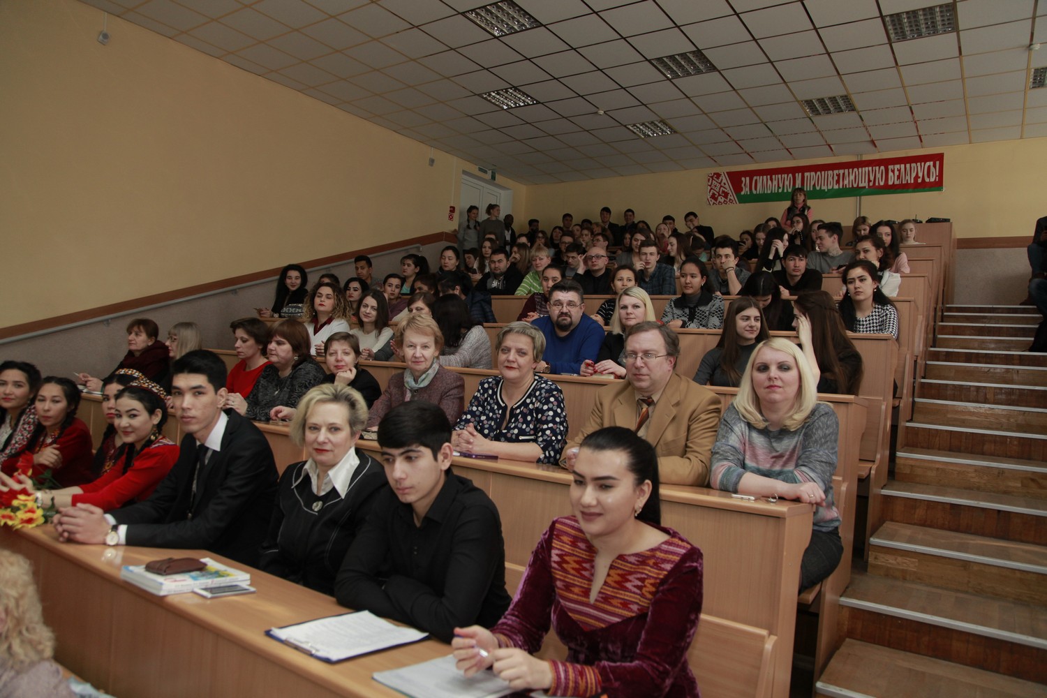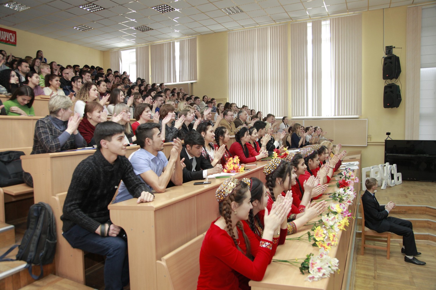 Студенты из Туркменистана Ягмурова Умида, Шакуров Камиль, Эййамбердиев Ашыр, Азизов Эламан, участники танцевального ансамбля «Цветы Туркмении» погрузили нас в поэзию известного туркменского поэта Махтумкули и реализовали на сцене творческий проект «Öne dine öne jan watanym Тurkmenistan!» (Вперёд, Туркменистан!).