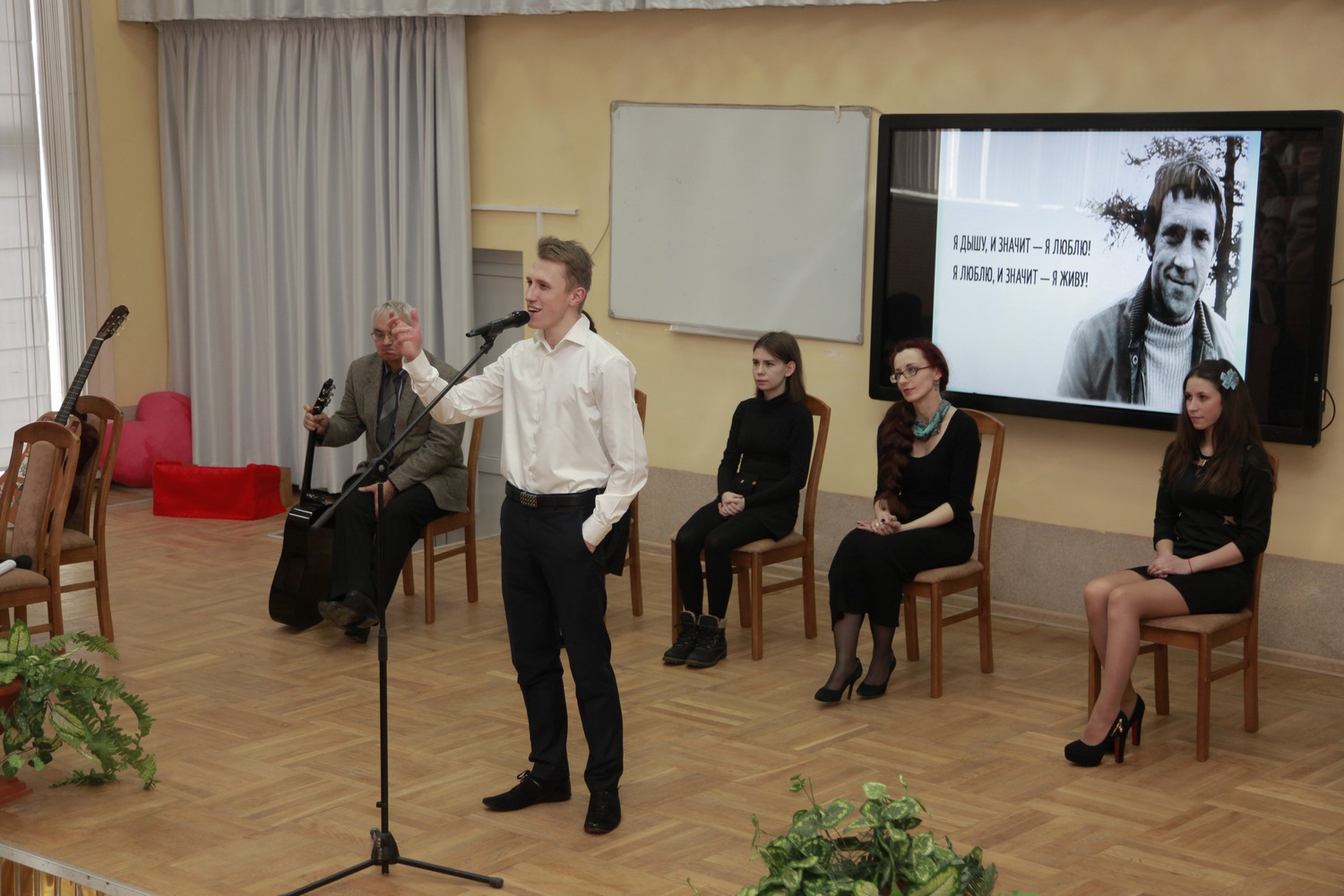 Литературно-музыкальная композиция «Язык, великолепный наш язык» была посвящена русскому языку и творчеству В.С. Высоцкого. Студенты Ковалёв Я., Рафальская В., Лахманькова А., Змушко К., Петровская М., Нароушвили А., преподаватели Кузьмич В.В., Сергушкова О.В. погрузили всех присутствующих в мир песенного и сценического искусства поэта. Роль В. Высоцкого на сцене исполнил финалист Республиканского конкурса «Студент года – 2017» Ян Ковалёв.
