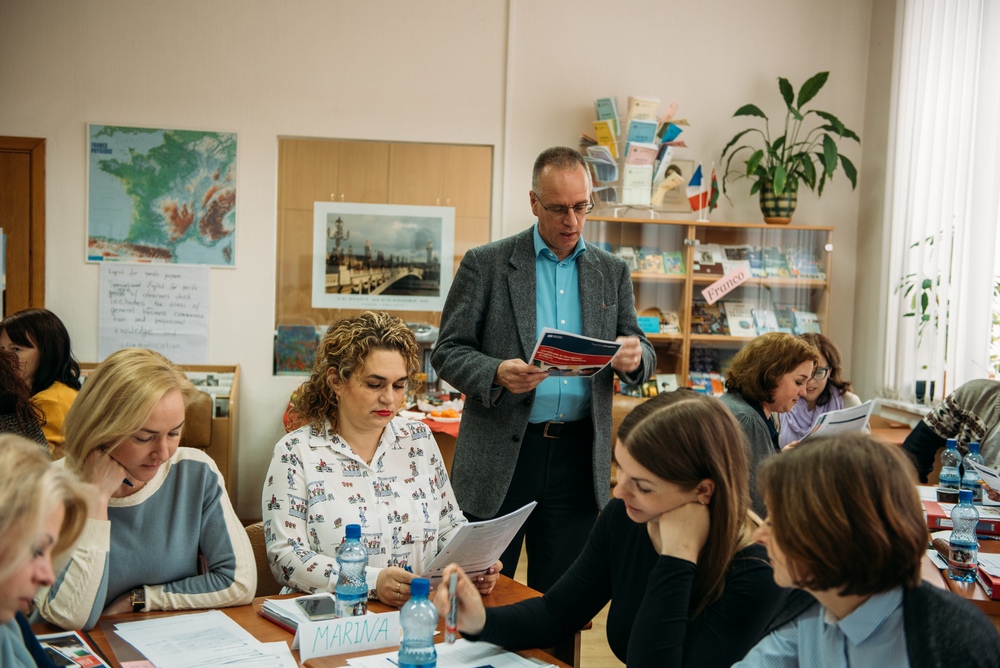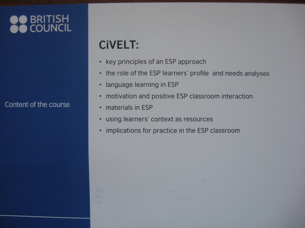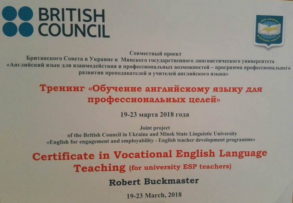 Тренингом по образовательной программе «Обучение английскому языку для профессиональных целей» / «Certificate in Vocational English Language Teaching (for university ESP teachers)» руководил Роберт Бакмастер (Robert Buckmaster): тренер и консультант в обучении английскому языку для профессиональных целей (an English language teaching consultant and trainer), разработчик английского проекта идей (the founder of the The English Ideas Project ); автор книг (the author of Teaching English: Being the Best and The Ideas of English Grammar); член латвийской Ассоциации Учителей английского языка (on the board of the Latvian Association of Teachers of English).