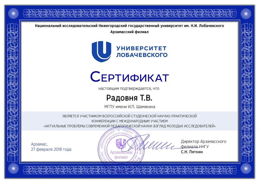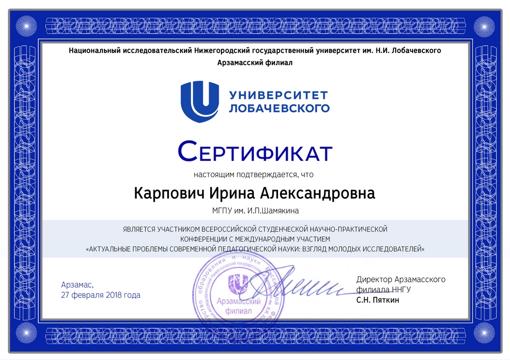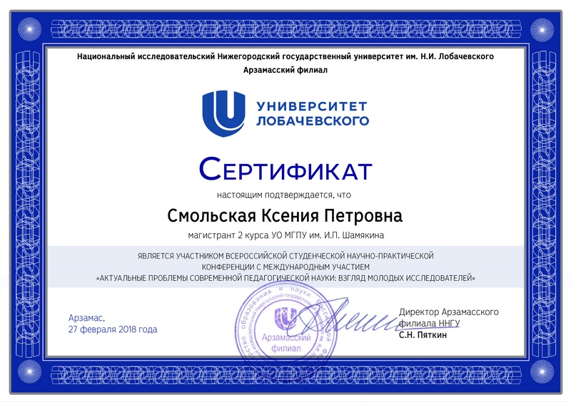 1.Смольская К.П., магистрант II года обучения, факультет дошкольного и начального образования, специальность «Образовательный менеджмент» (науч. руководитель – доктор пед. наук, профессор Болбас В.С.)