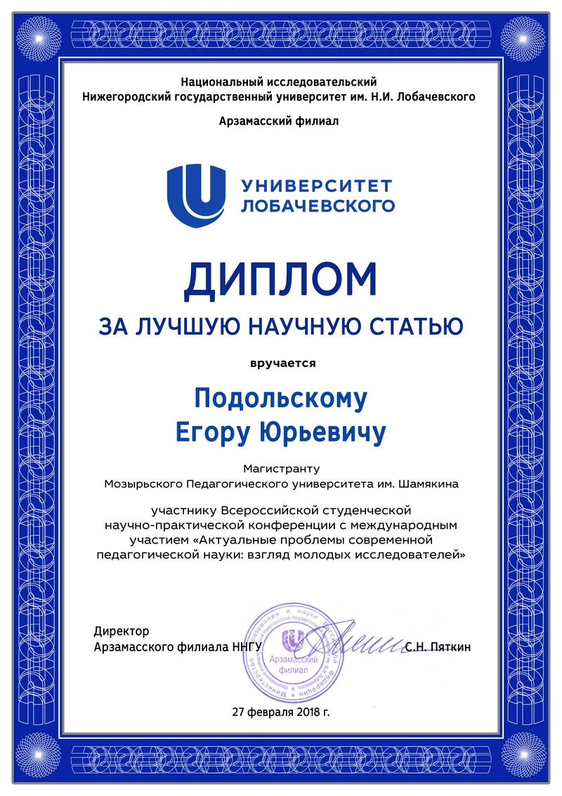 2.Подольский Е.Ю., магистрант I года обучения, факультет дошкольного и начального образования, специальность «Образовательный менеджмент» (науч. руководитель – кандидат пед. наук, доцент Болбас Г.В.)