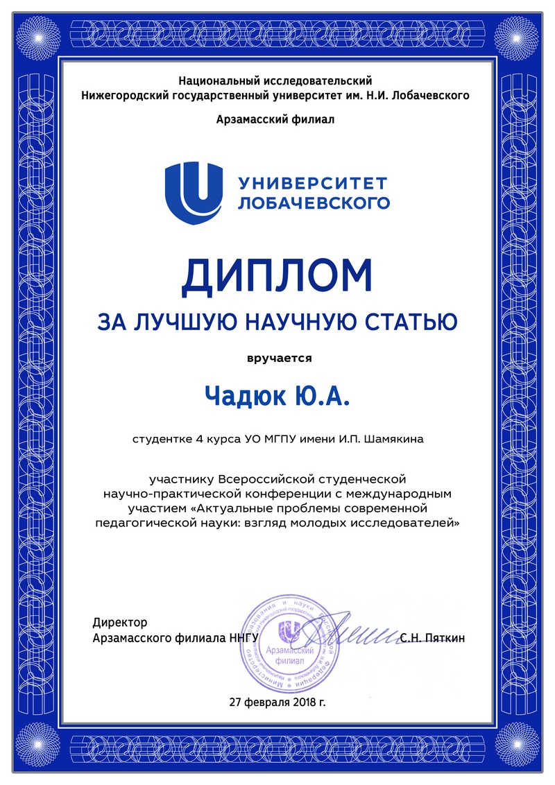 3.Чадюк Ю.А., студентка IV курса факультета дошкольного и начального образования, специальность «Дошкольное образование» (науч. руководитель – кандидат пед. наук, доцент Асташова А.Н.)