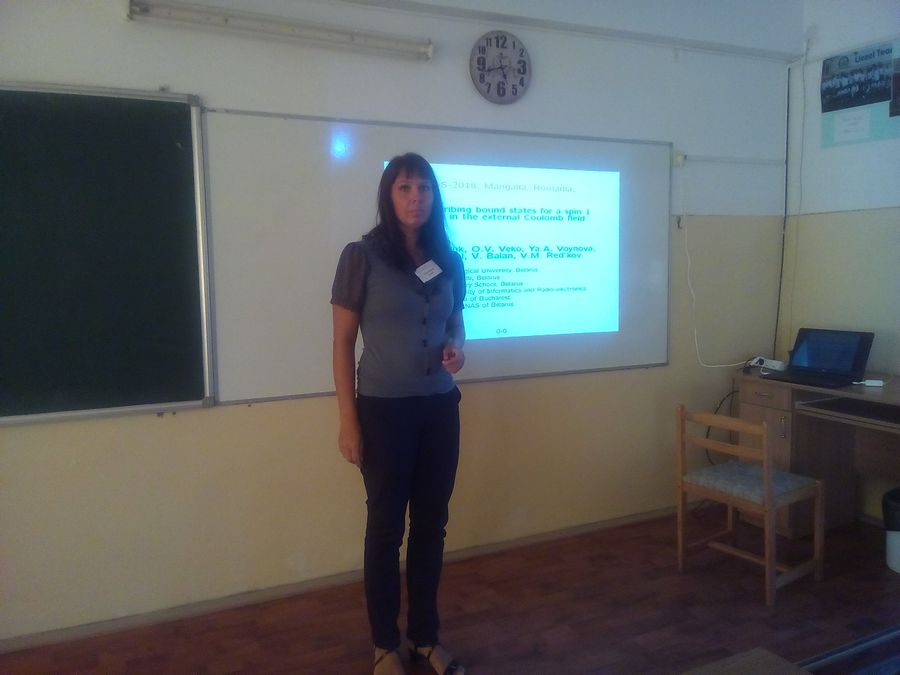 Овсиюк Е.М. выступила с устным докладом «Spin 1 particle with polarizability in the external Coulomb field, nonrelativistic description» («Частица со спином 1 и поляризуемостью во внешнем кулоновском поле, нерелятивистское описание»; авторы: Е.М. Овсиюк, О.В. Веко, Я.А. Войнова, В.М. Редьков), вызвавшим интерес у участников конференции.