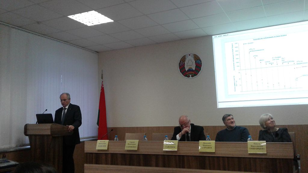 С докладом «О направлениях деятельности БРФФИ» выступил Сергей Васильевич Гапоненко, директор Исполнительной дирекции Белорусского республиканского фонда фундаментальных исследований НАН Беларуси, академик, доктор физико-математических наук, профессор.