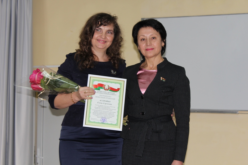 За высокие научные результаты, активную работу по внедрению инновационных технологий в процесс обучения студентов (магистрантов) Почетную грамоту Мозырского районного исполнительного комитета вручили доценту кафедры педагогики и психологии, кандидату педагогических наук, доценту Елене Сергеевне АСТРЕЙКО. Грамотой Мозырского районного Совета депутатов награждена Людмила Владимировна ГАВРИЛОВЕЦ, кандидат исторических наук, доцент, за добросовестный труд, большой личный вклад в развитие науки и подготовку высококвалифицированных научно-педагогических кадров.