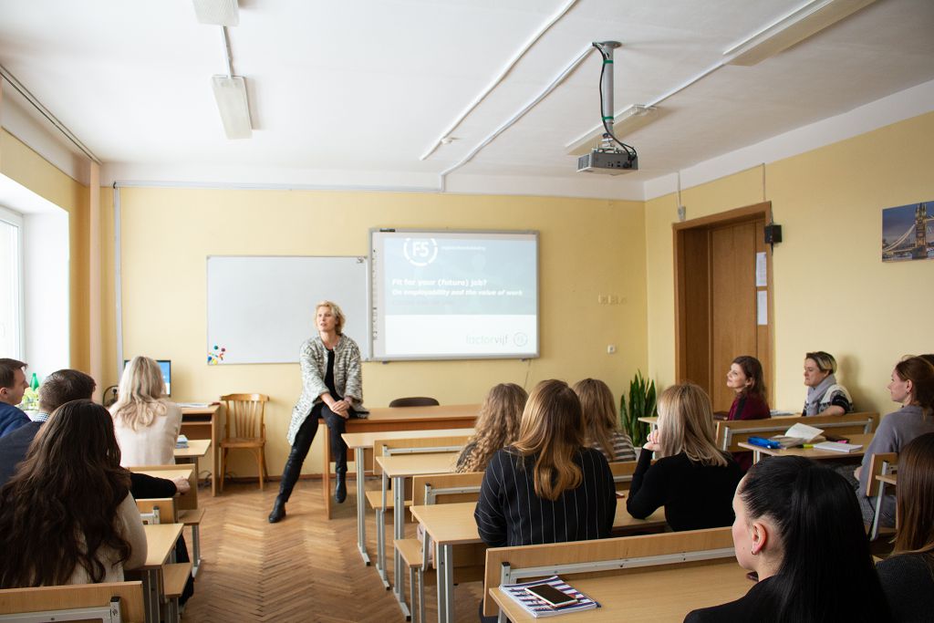 Это был настоящий мастер-класс от Кристел Вилэми Онтонет ван де Вен, которая посредством ярких примеров стимулировала студентов к саморазвитию и самосовершенствованию. Студенты имели возможность побеседовать с гостями из Нидерландов. Наших студентов интересовали вопросы, связанные с устройством системы высшего образования Королевства, со степенью мотивированности молодежи получать высшее образование, с трудоустройством молодых специалистов. В качестве благодарности студенты Ковалев Ян и Соколова Аудроне исполнили две музыкальные композиции, вызвав чувство искреннего восторга у всех присутствующих.