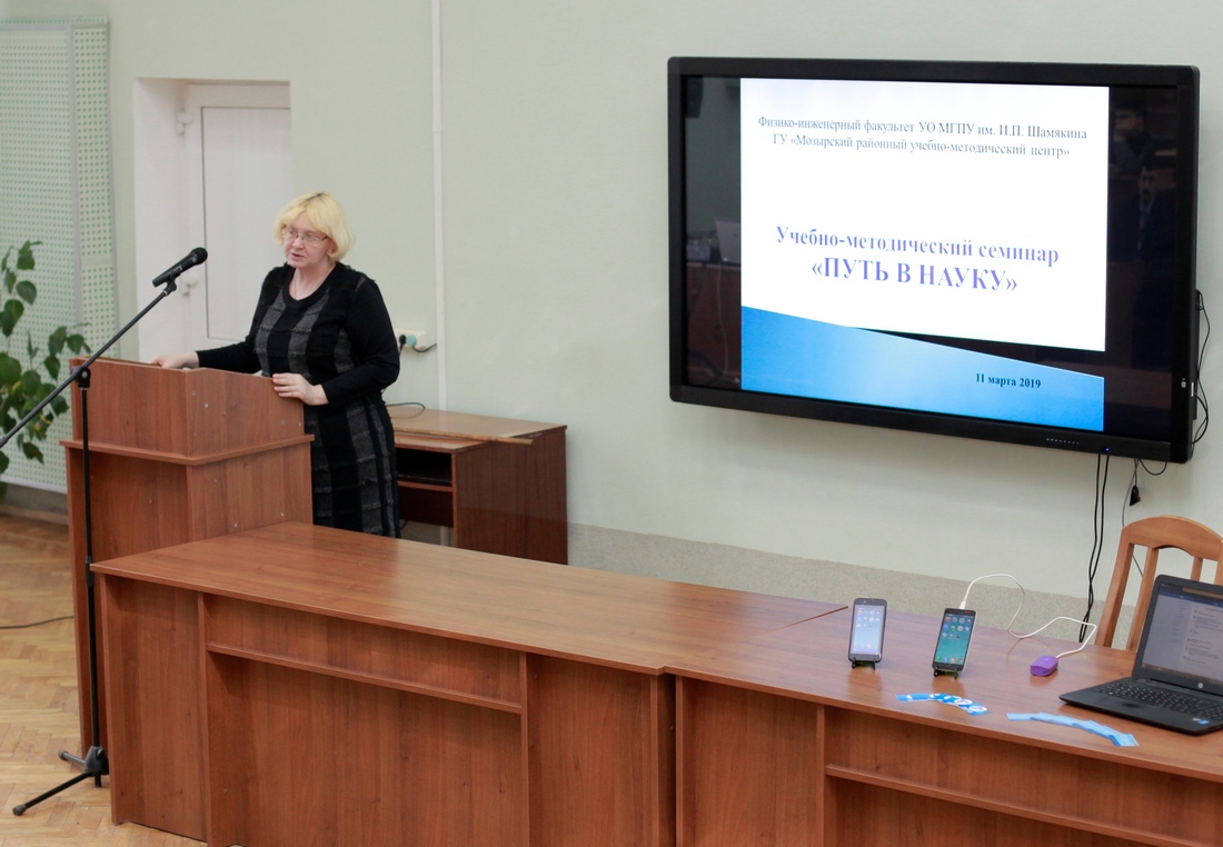 Большой интерес участников семинара вызвала исследовательская работа «Батарейка из овощей и фруктов», выполненная под её руководством. С исследовательской работой «Расчет удельной теплоты плавления» познакомила учащаяся ГУО «Средней школы №14 г. Мозыря» М. Кравченко, научным консультантом которой является кандидат физико-математических наук, доцент кафедры физики и математики Т.В. Николаенко. Студент 3 курса физико-инженерного факультета М.Н.Томашевич рассказал об авторском исследовательском проекте «Удаленный сервис программного обеспечения смартфонов Android blog Support Team», который был представлен на республиканском конкурсе «100 идей для Беларуси» от города Мозырь. Учащихся лицеев и колледжей заинтересовал исследовательский проект «Разработка защитных составов для строительных конструкций», представленный старшим преподавателем кафедры инженерно-педагогического образования В. П. Дубодел.