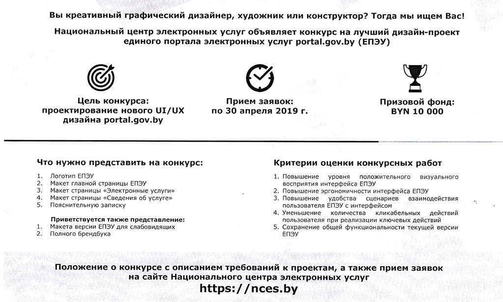Республиканское унитарное предприятие «Национальный центр электронных услуг» (далее - НЦЭУ) информирует о проведении с 01.03.2019 по 07.06.2019 открытого публичного конкурса «Лучший дизайн Единого портала электронных услуг».