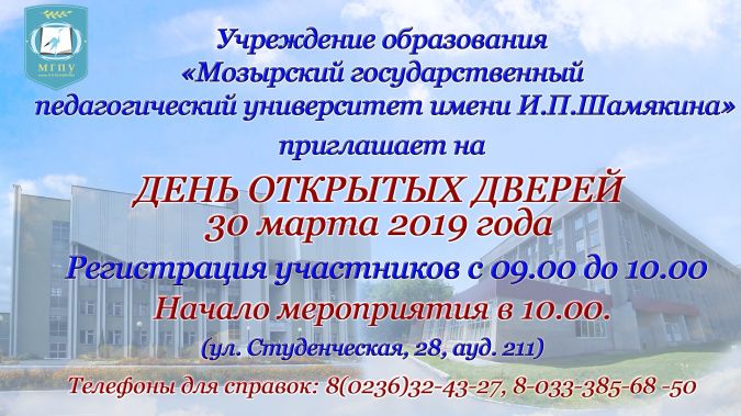 10.00 – 10.15 – доклад-презентация «Учреждение образования «Мозырский государственный педагогический университет имени И.П.Шамякина» – крупный образовательный, научный и культурный центр Белорусского Полесья». Информация о централизованном тестировании. Выступление заведующего сектором довузовской подготовки профориентации, кандидата филологических наук, доцента Н.И.Новик-Щербенко