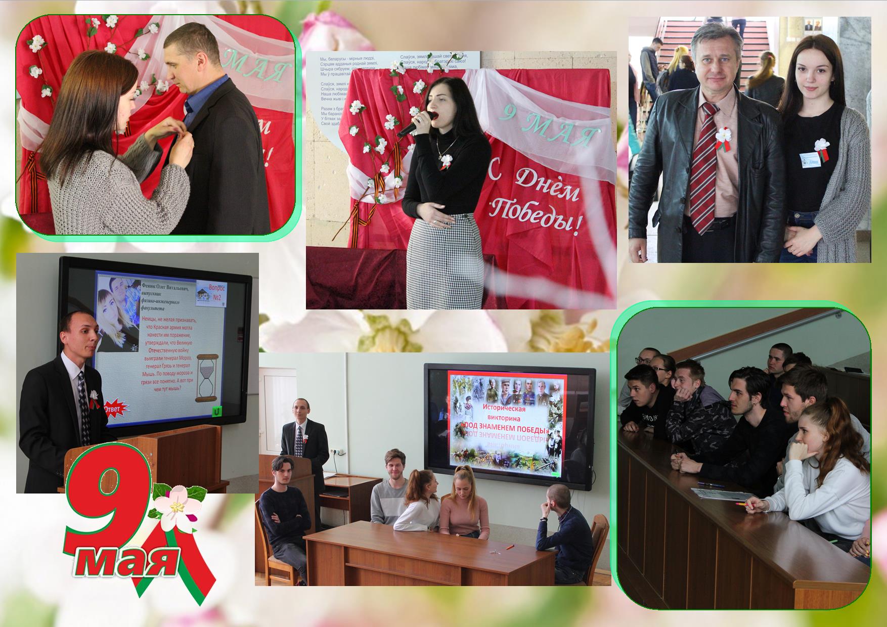 10 мая силами студенческого самоуправления организован и проведен мини-концерт «Память Победы». Песни военных лет, исполненные студентами-активистами Полын Анной, Ляшуком Андреем, Цюцюрой Александрой и Светогор Павлой позволили прикоснуться и прочувствовать каждому присутствующему трагедию и боль судеб, опаленных войной, их любовь и преданность стране и близким людям. Волонтеры физико-инженерного факультета организовали акцию, в ходе которой раздавали присутствующим красно-зеленые ленточки, подчеркивая тем самым историческую значимость Дня Победы, его великую роль в становлении и развитии Республики Беларусь.