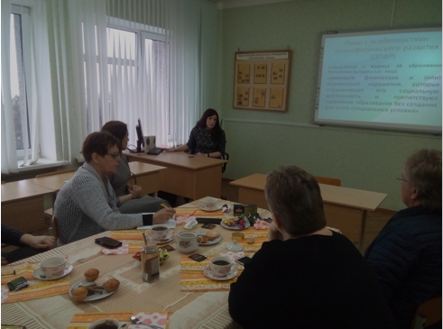 Программа визита продолжилась встречей с преподавателями кафедры педагогики и психологии в форме круглого стола на тему «Современные подходы к организации педагогического взаимодействия с учащимися с различными образовательными потребностями». Особый интерес у гостей вызвало выступление доцента кафедры специальной педагогики и методик дошкольного и начального образования Наталии Семеновны Жлудовой, представившей специфику организации инклюзивного образования не только в Беларуси, но и в Мозырском регионе.